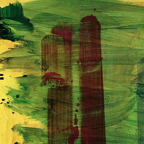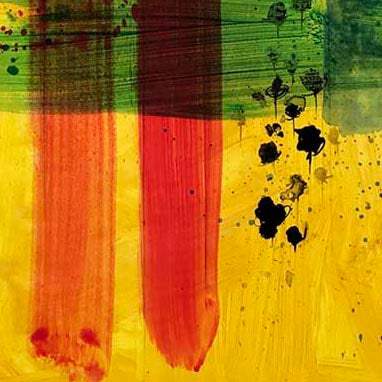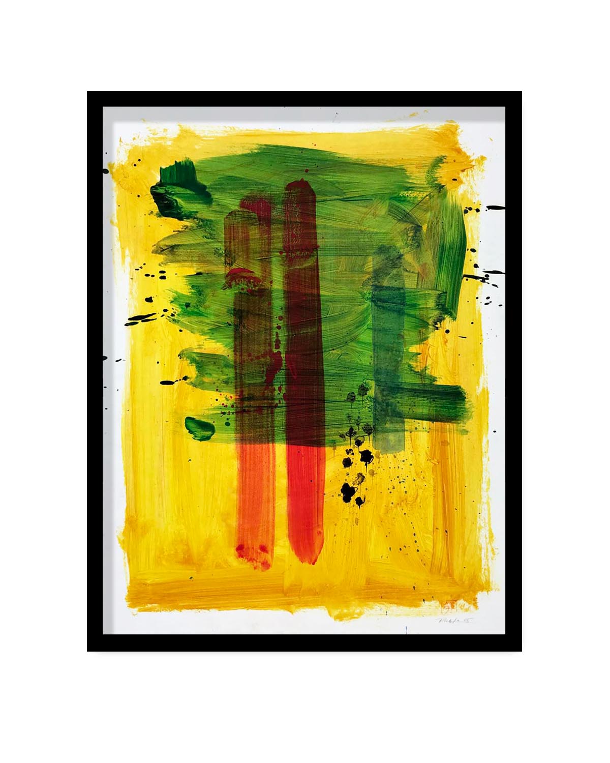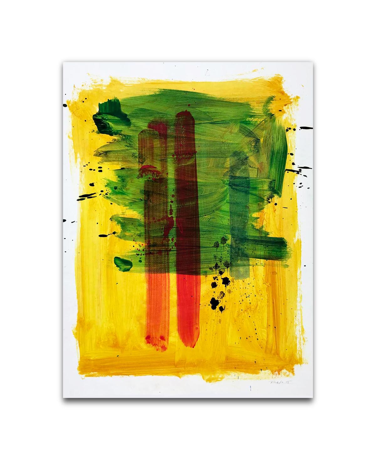 This piece is a bold, abstract composition built from broad, expressive brushstrokes and vibrant primary colors. A warm yellow field spreads across the entire surface, forming a radiant backdrop. Over it, a dense swath of layered green sweeps horizontally, slightly translucent so that the yellow still glows through in places. Cutting through the center are two vertical red bars, slightly uneven, with hints of darker crimson where the strokes overlap the green. Around these forms, splashes and drips of black paint scatter freely, adding movement and a sense of spontaneity.