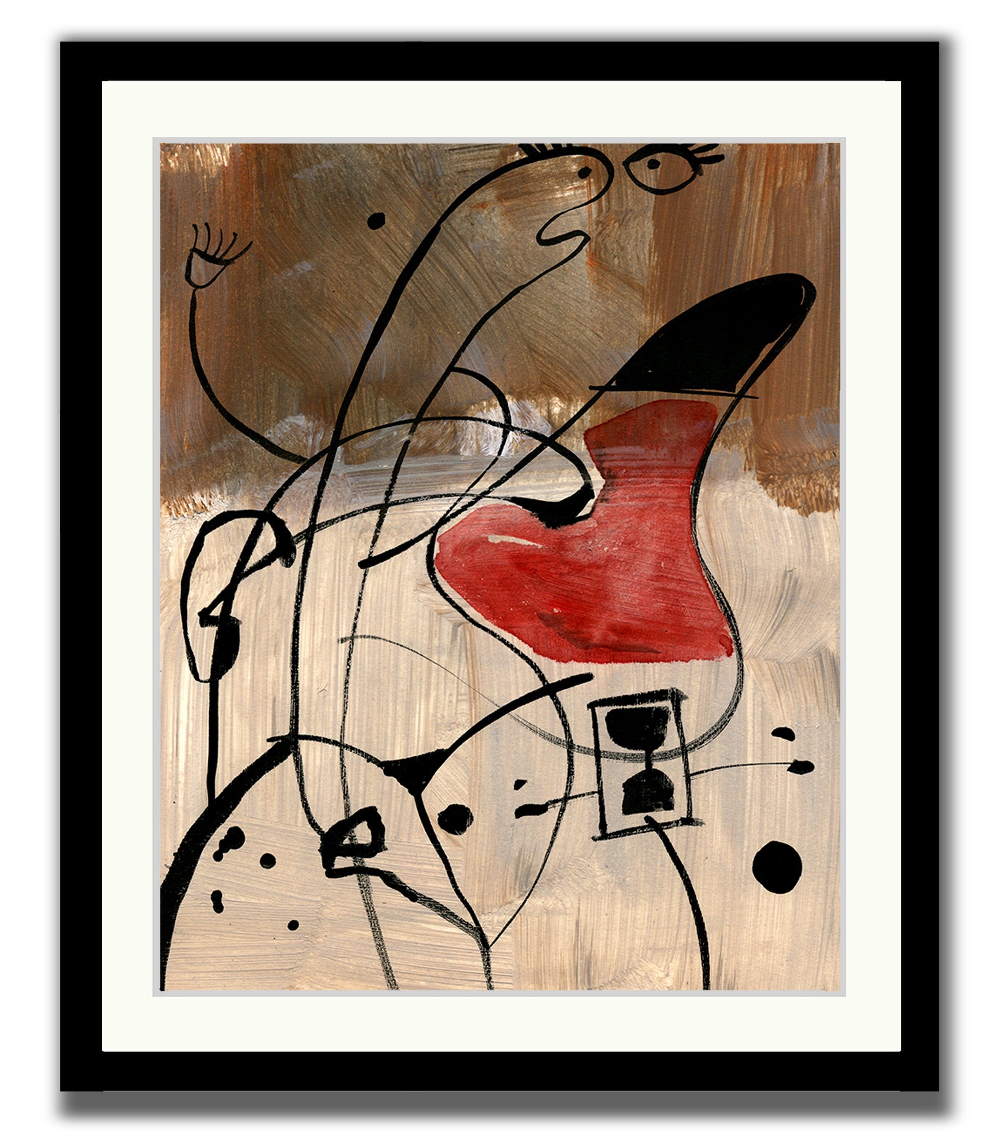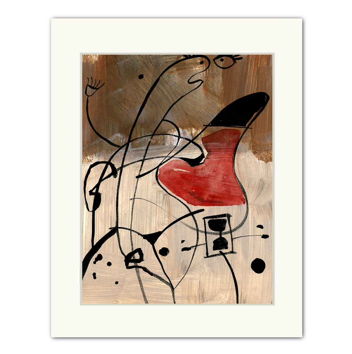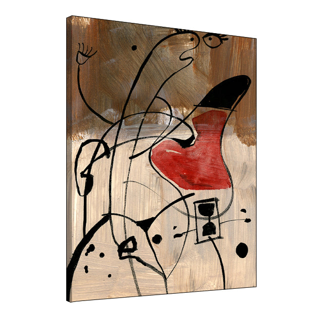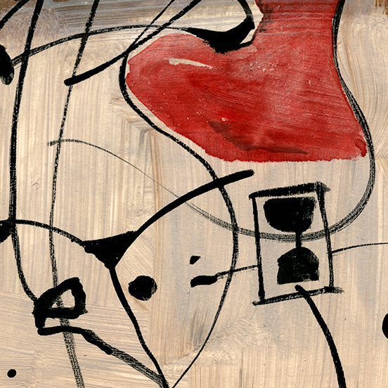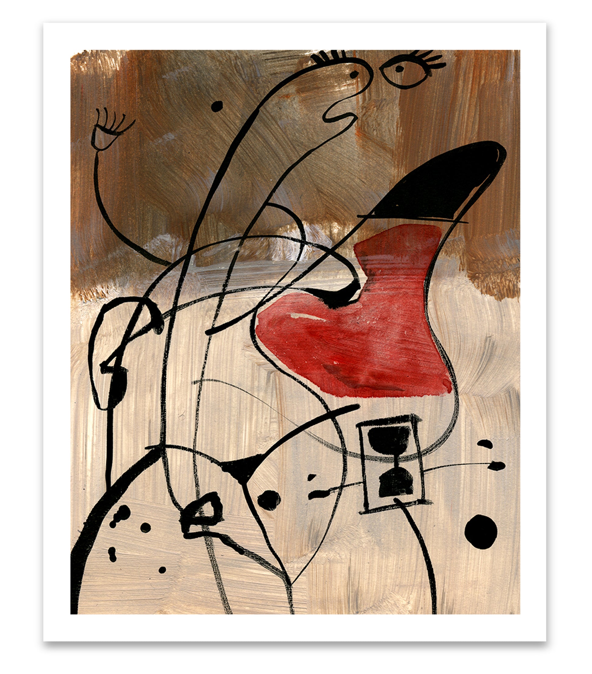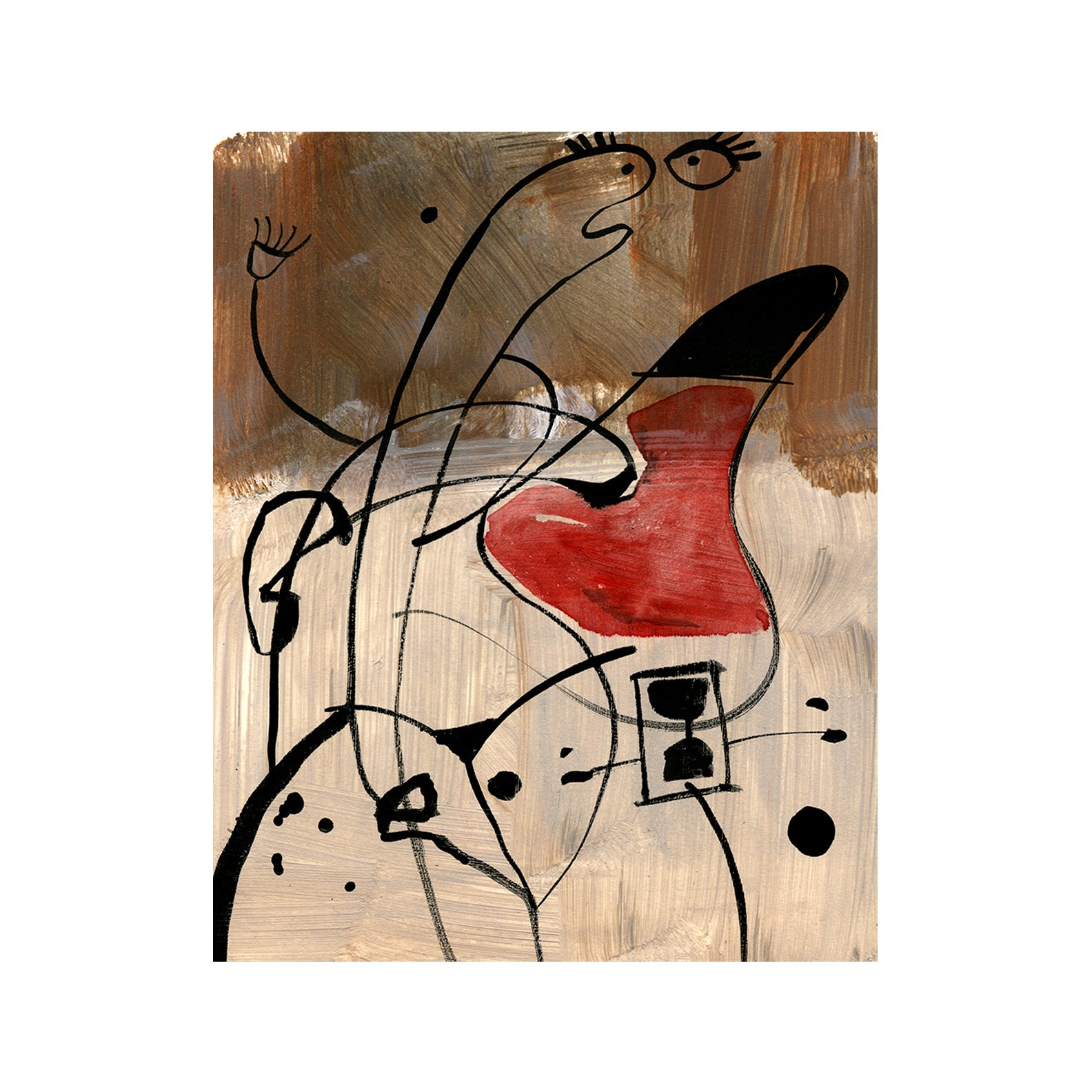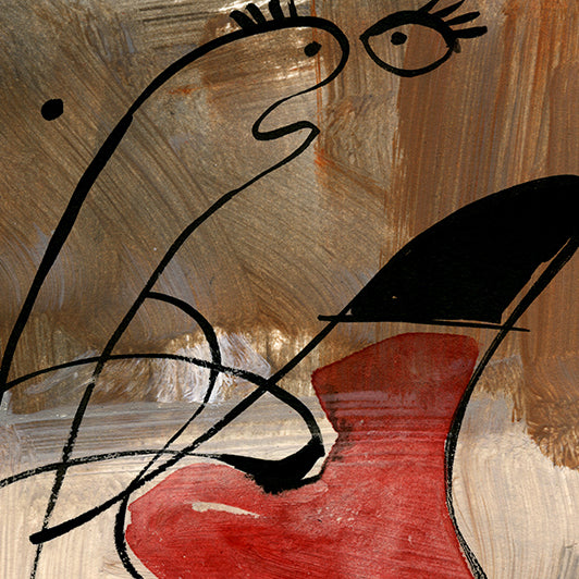.The artwork Argumentative is an abstract painting that uses bold lines and shapes to suggest figures in conflict. Loose black lines twist and overlap across a textured brown and beige background, forming expressive, almost cartoon-like faces. One shape is painted with a striking red form, standing out like a heart or a mouth in mid-speech. The figures appear animated, as if caught in a heated exchange. The style is playful yet sharp, with simple lines and minimal color creating a lively sense of tension.