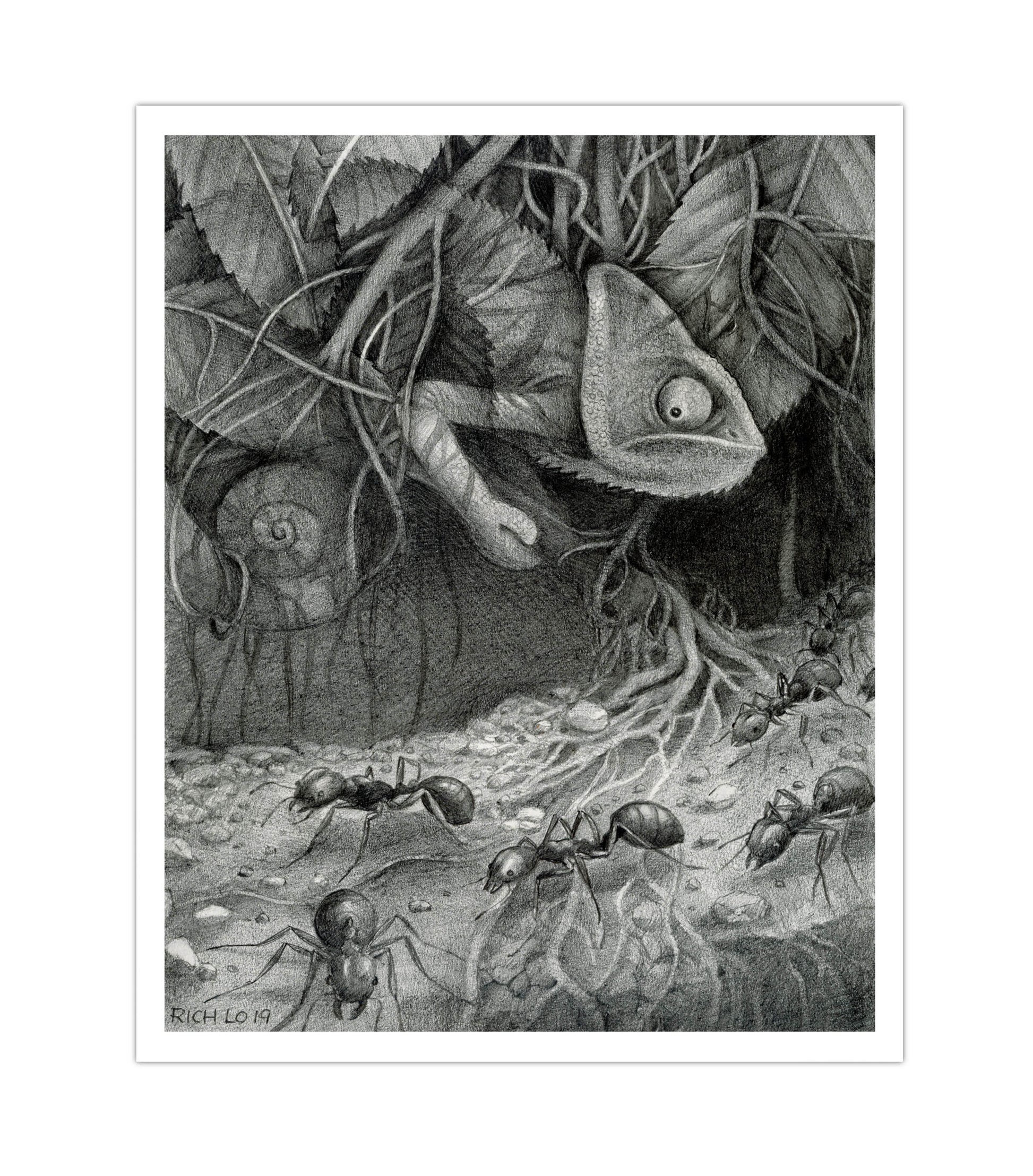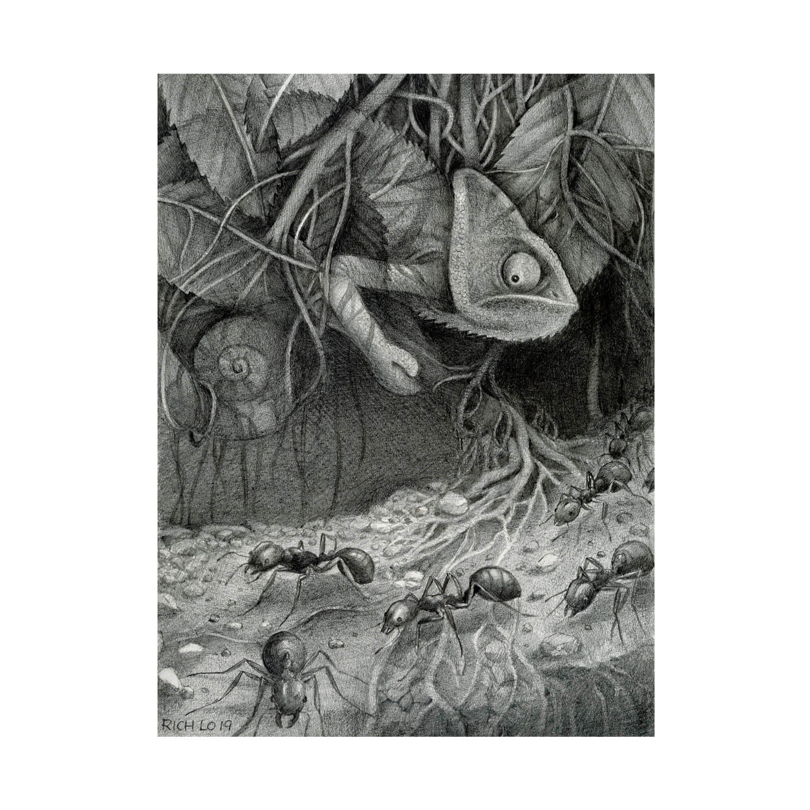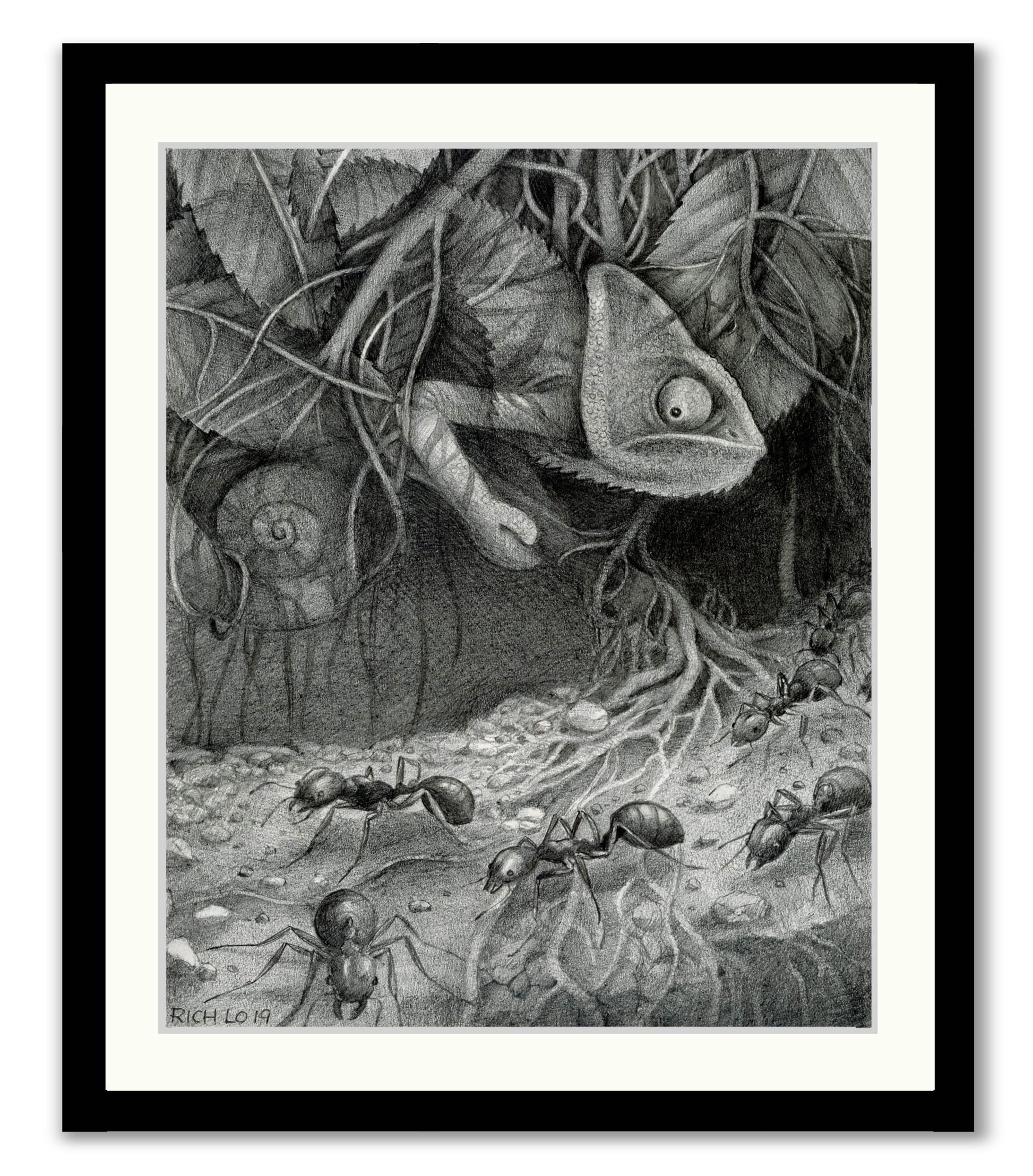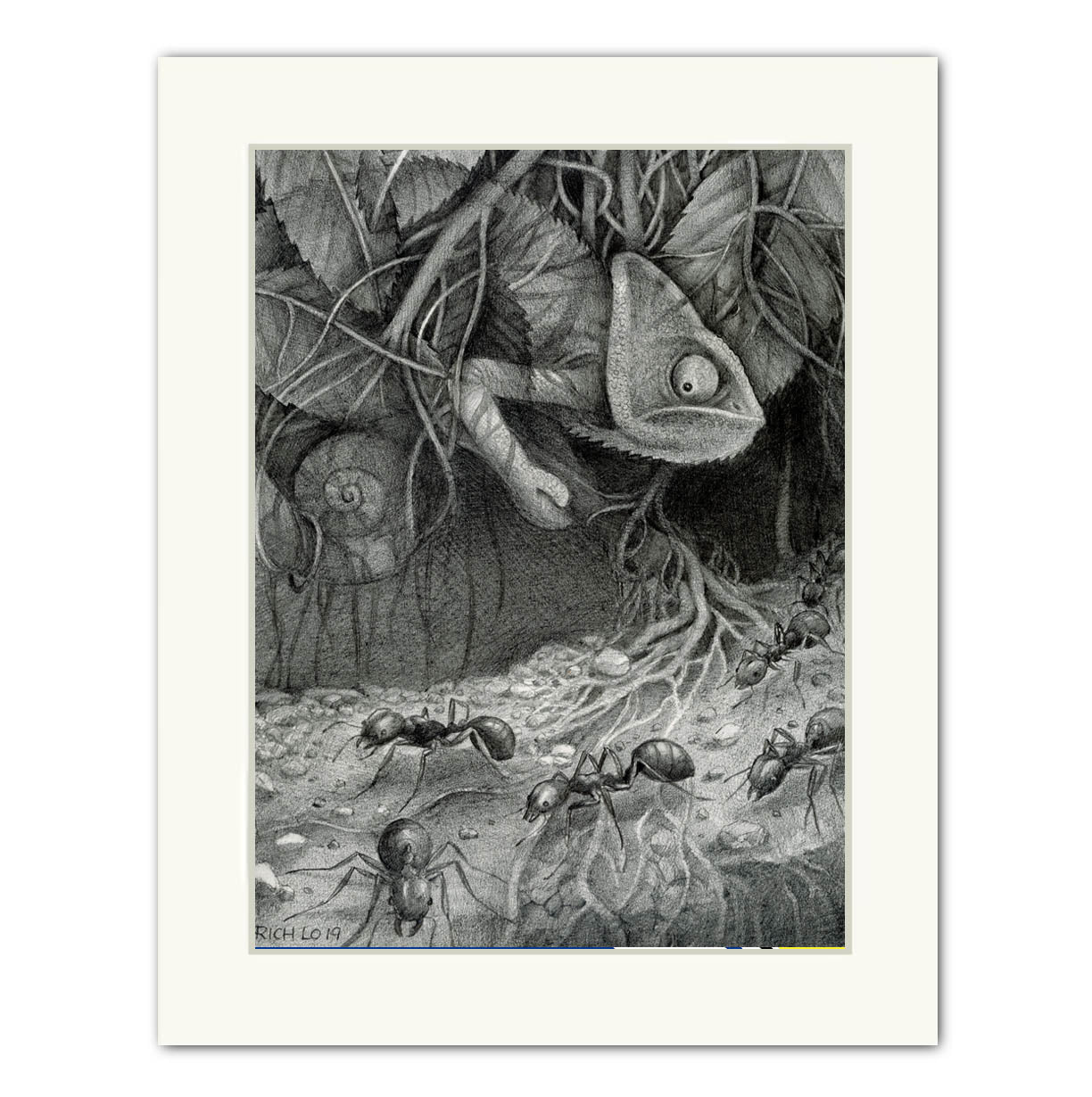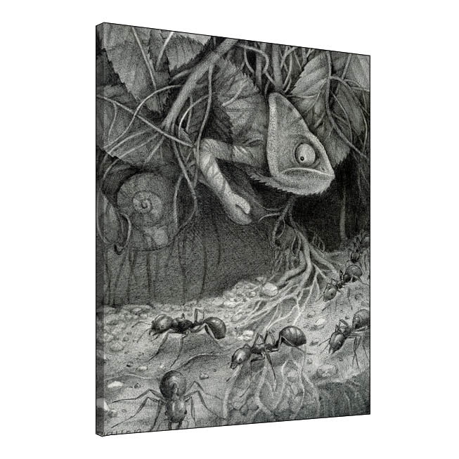Camouflage presents a fascinating study of natural concealment and survival in the miniature world of forest floor ecology. The composition creates a complex visual puzzle that mirrors the very concept of camouflage it depicts.