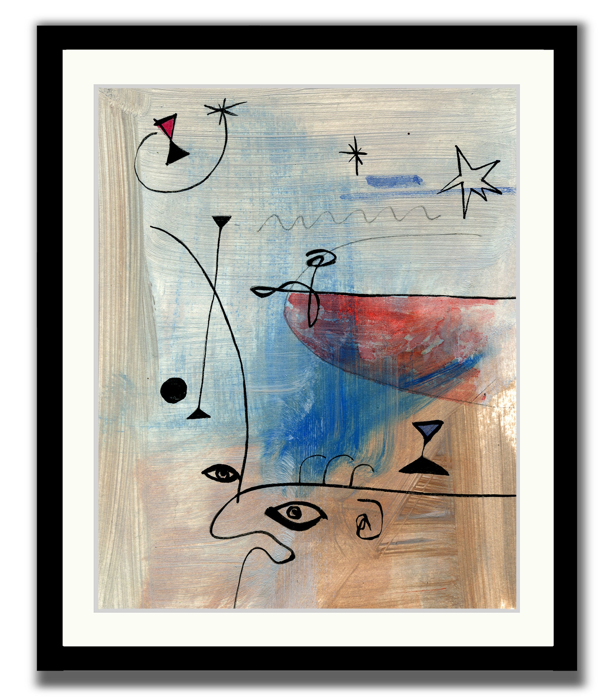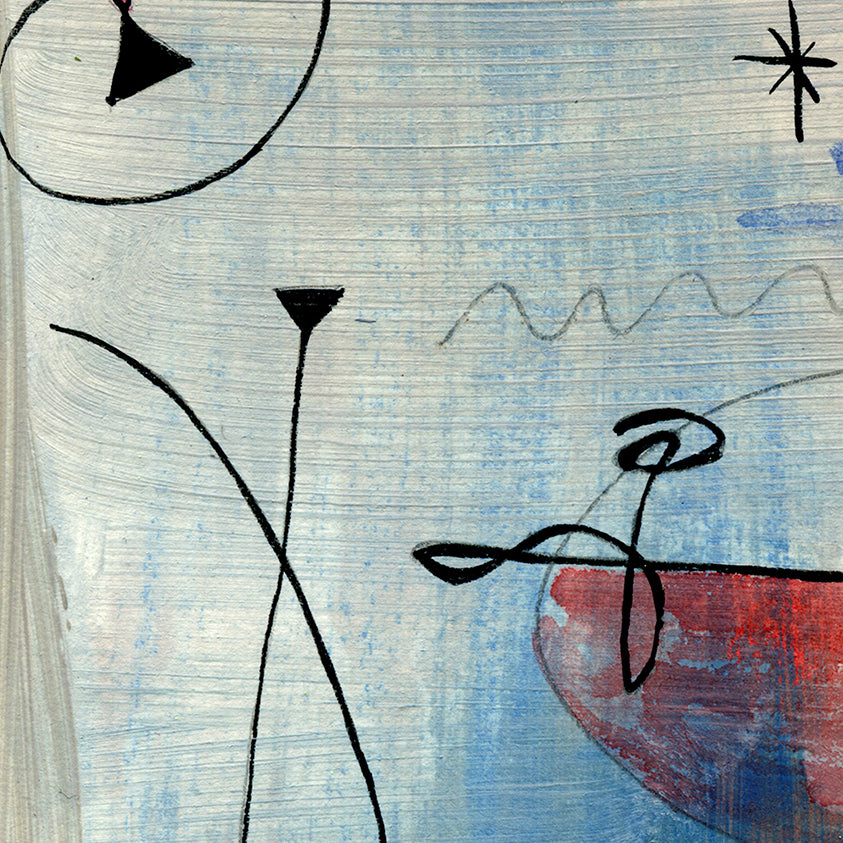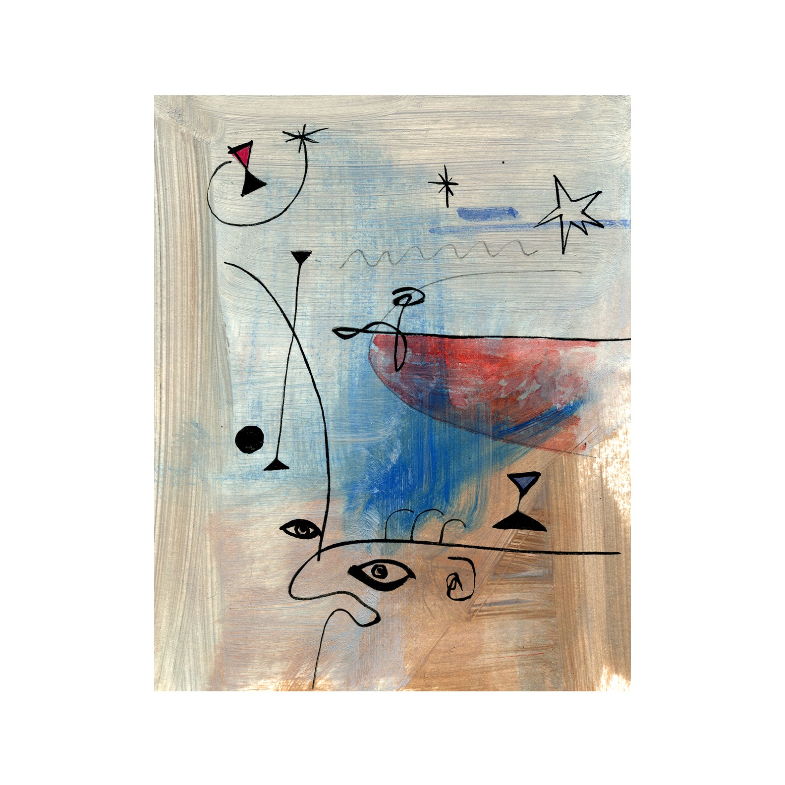 Conversation at the Bar is an abstract, modernist-style artwork with a playful, surreal quality. The composition features a mix of organic and geometric forms rendered in black line work against a textured background of blues, reds, and neutral tones. The piece includes several distinctive elements: curved lines that flow throughout the composition, star-like shapes scattered across the upper portion, what appears to be an eye motif, and various abstract forms that could suggest figures or objects. There's a red curved shape that might represent a vessel or organic form, and the overall style has echoes of artists like Joan Miró with its biomorphic shapes and whimsical character. The background appears to be created with watercolor or similar wet media, creating soft washes of blue and warm tones, while the black linear elements are drawn over this foundation. The composition has a spontaneous, improvisational quality that's characteristic of mid-20th century abstract expressionism and surrealism.