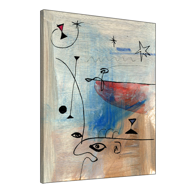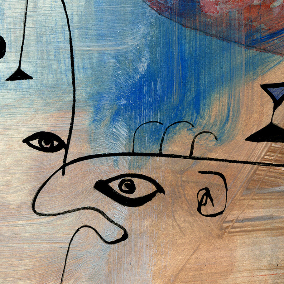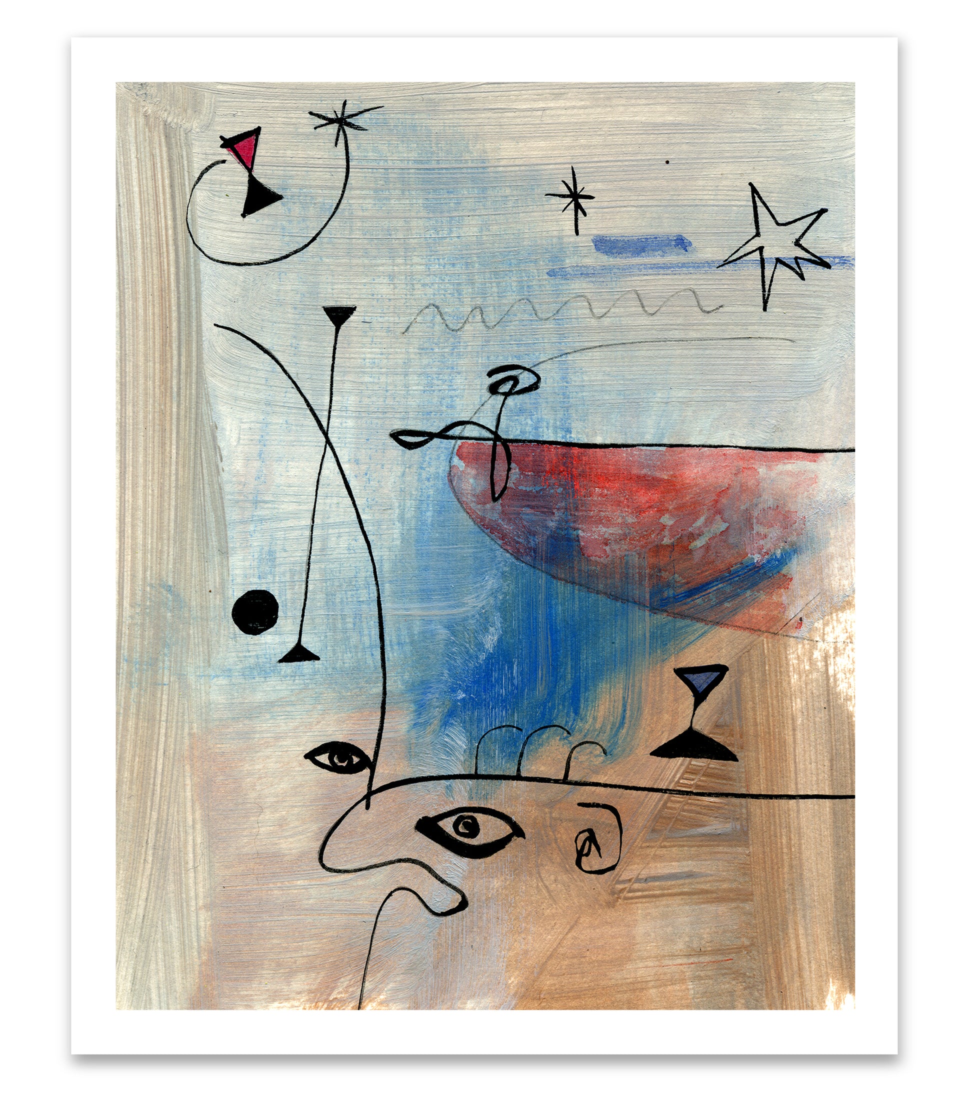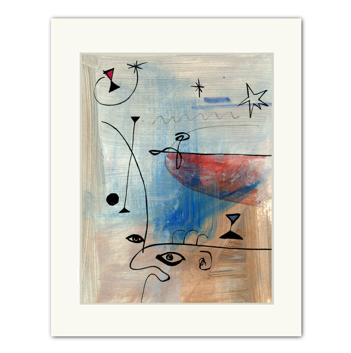 Conversation at the Bar is an abstract, modernist-style artwork with a playful, surreal quality. The composition features a mix of organic and geometric forms rendered in black line work against a textured background of blues, reds, and neutral tones. The piece includes several distinctive elements: curved lines that flow throughout the composition, star-like shapes scattered across the upper portion, what appears to be an eye motif, and various abstract forms that could suggest figures or objects. There's a red curved shape that might represent a vessel or organic form, and the overall style has echoes of artists like Joan Miró with its biomorphic shapes and whimsical character. The background appears to be created with watercolor or similar wet media, creating soft washes of blue and warm tones, while the black linear elements are drawn over this foundation. The composition has a spontaneous, improvisational quality that's characteristic of mid-20th century abstract expressionism and surrealism.