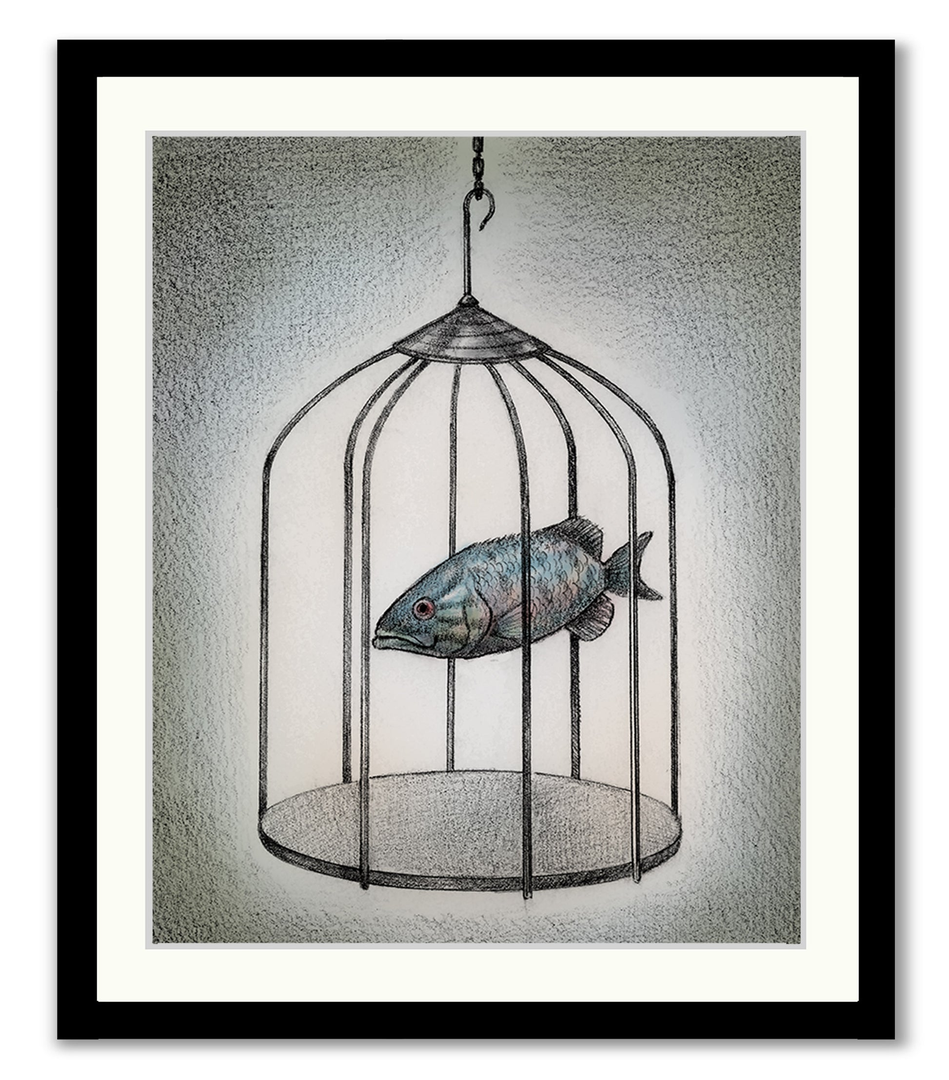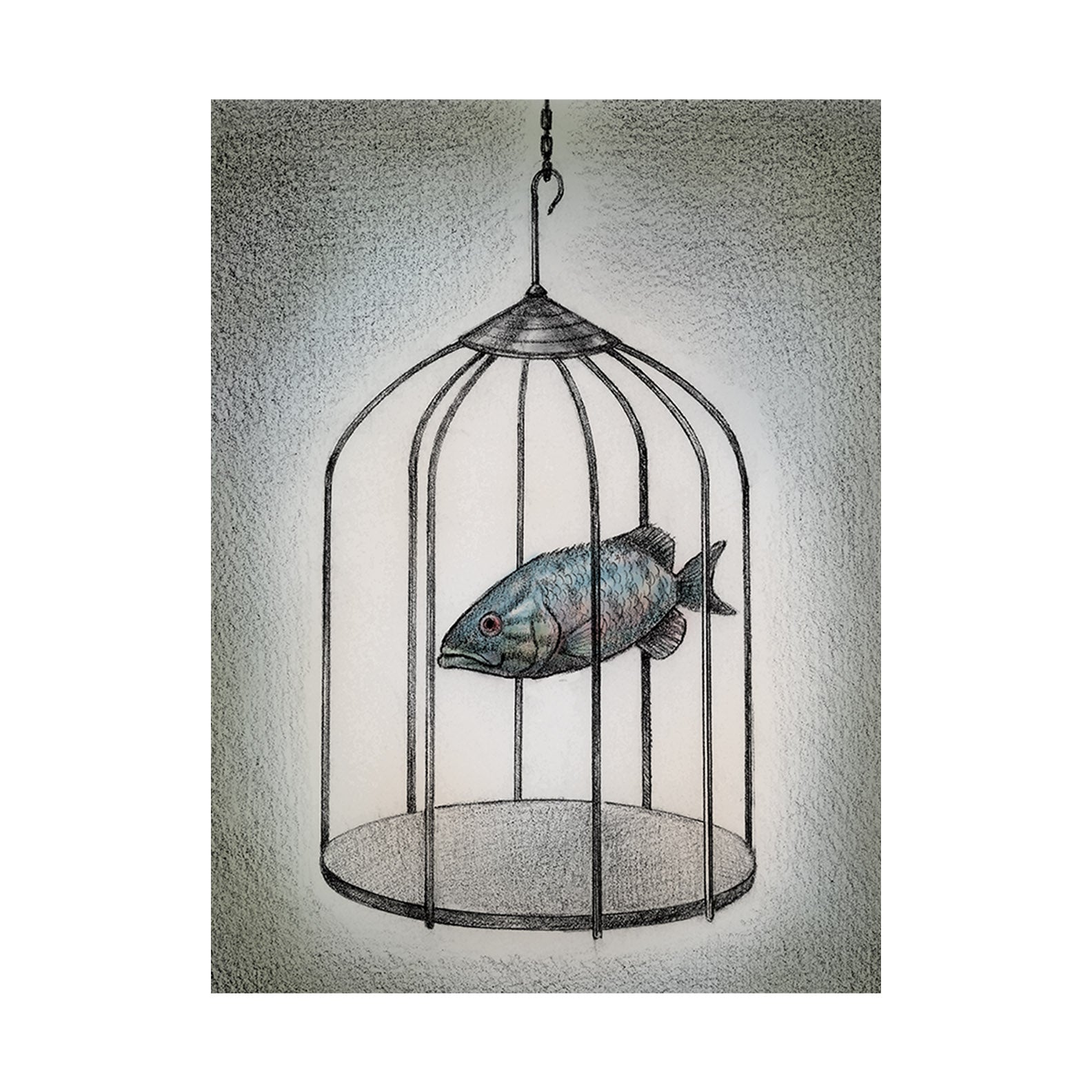 Fish Cage is a surreal, thought-provoking artwork that depicts a fish suspended inside a birdcage. The piece is rendered in a detailed, sketch-like style with crosshatching and shading techniques that give it an etched or engraved quality.