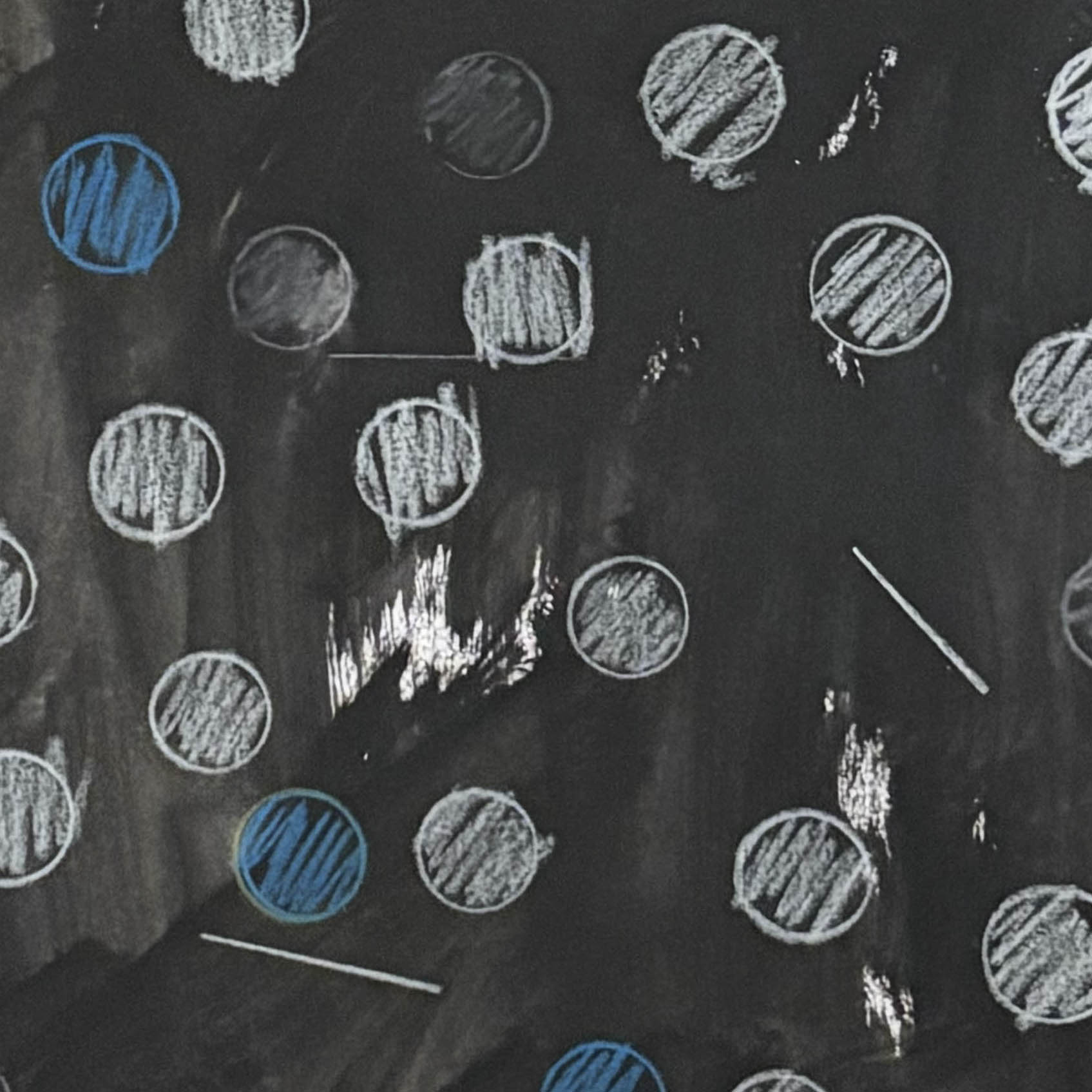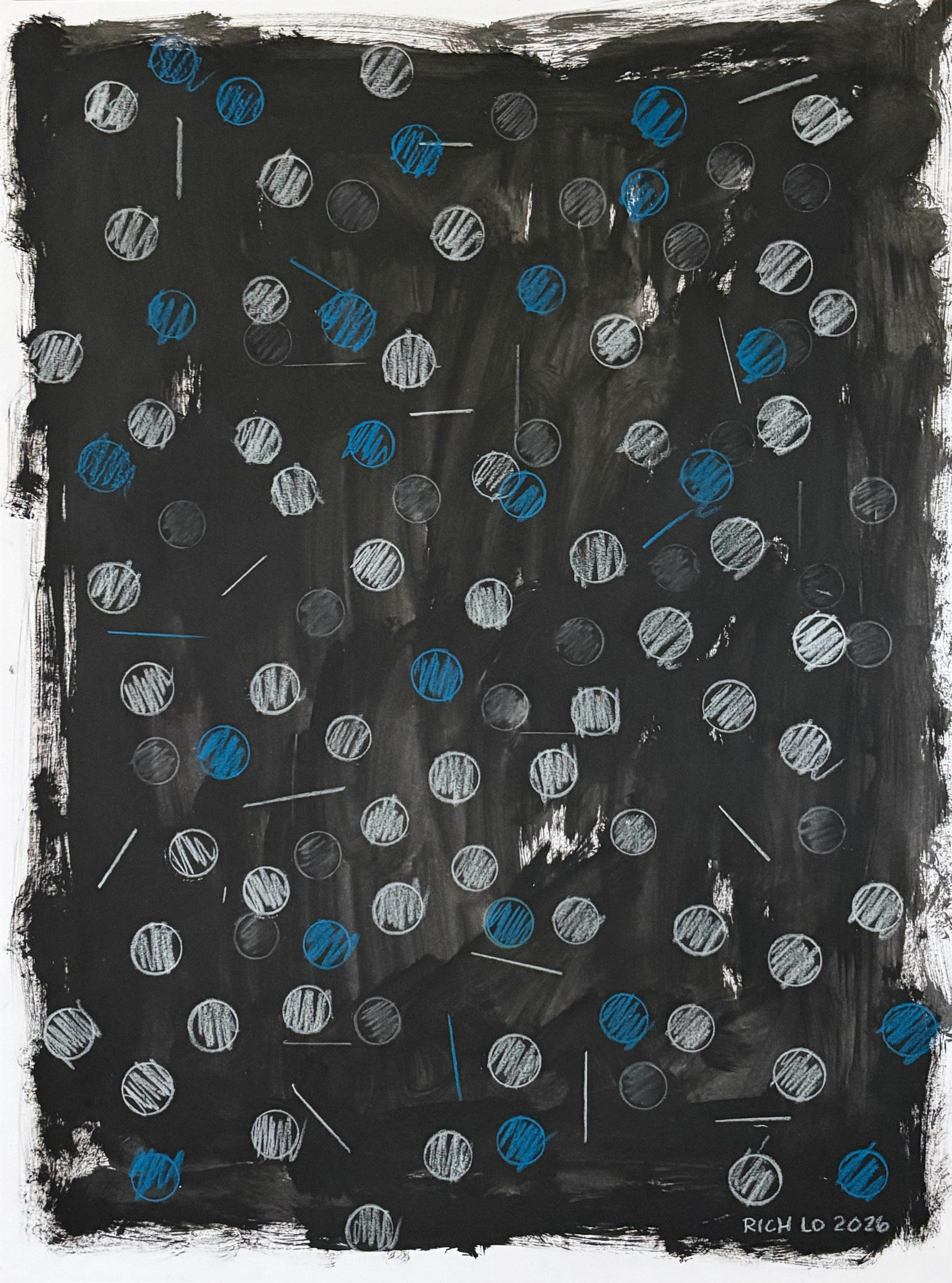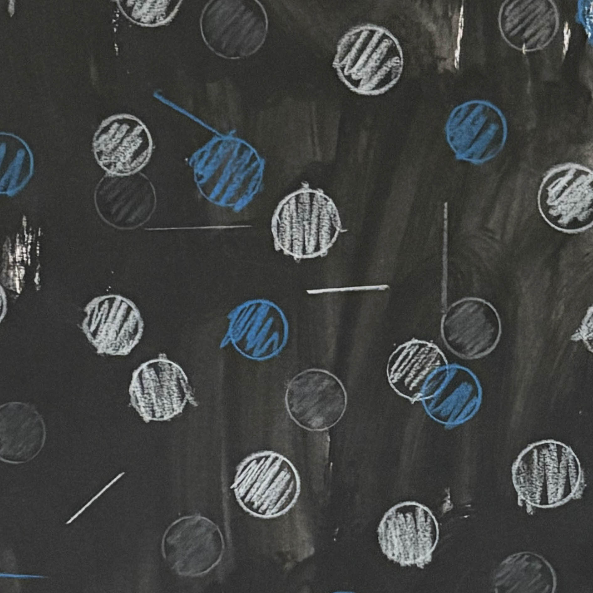 This drawing features a playful yet sophisticated composition set against a deep black background.