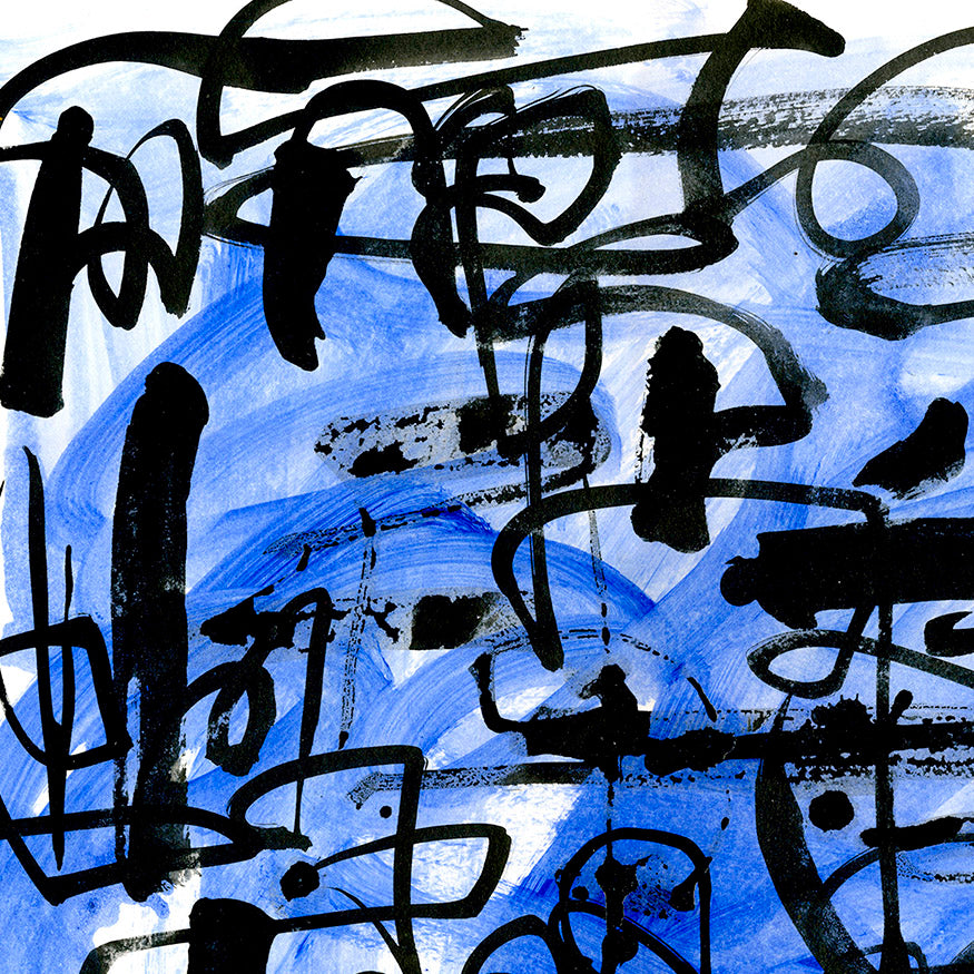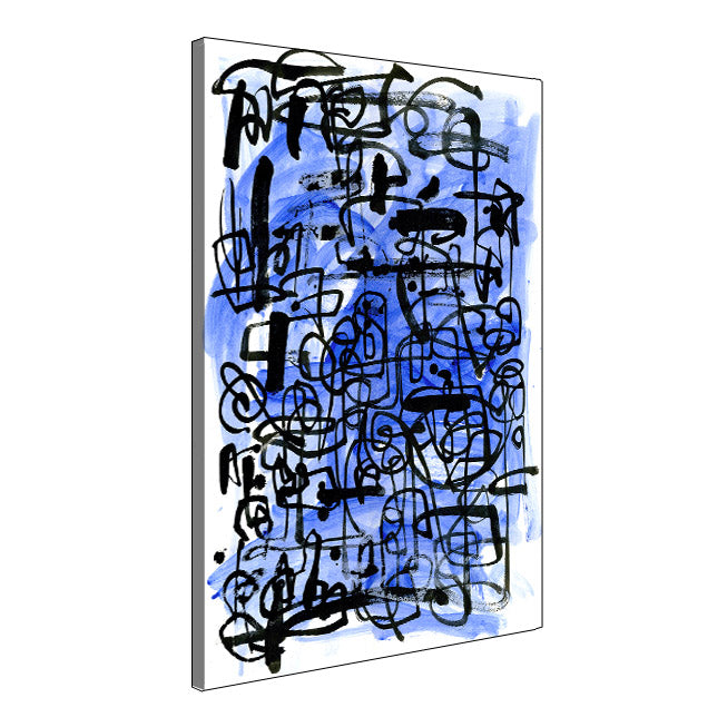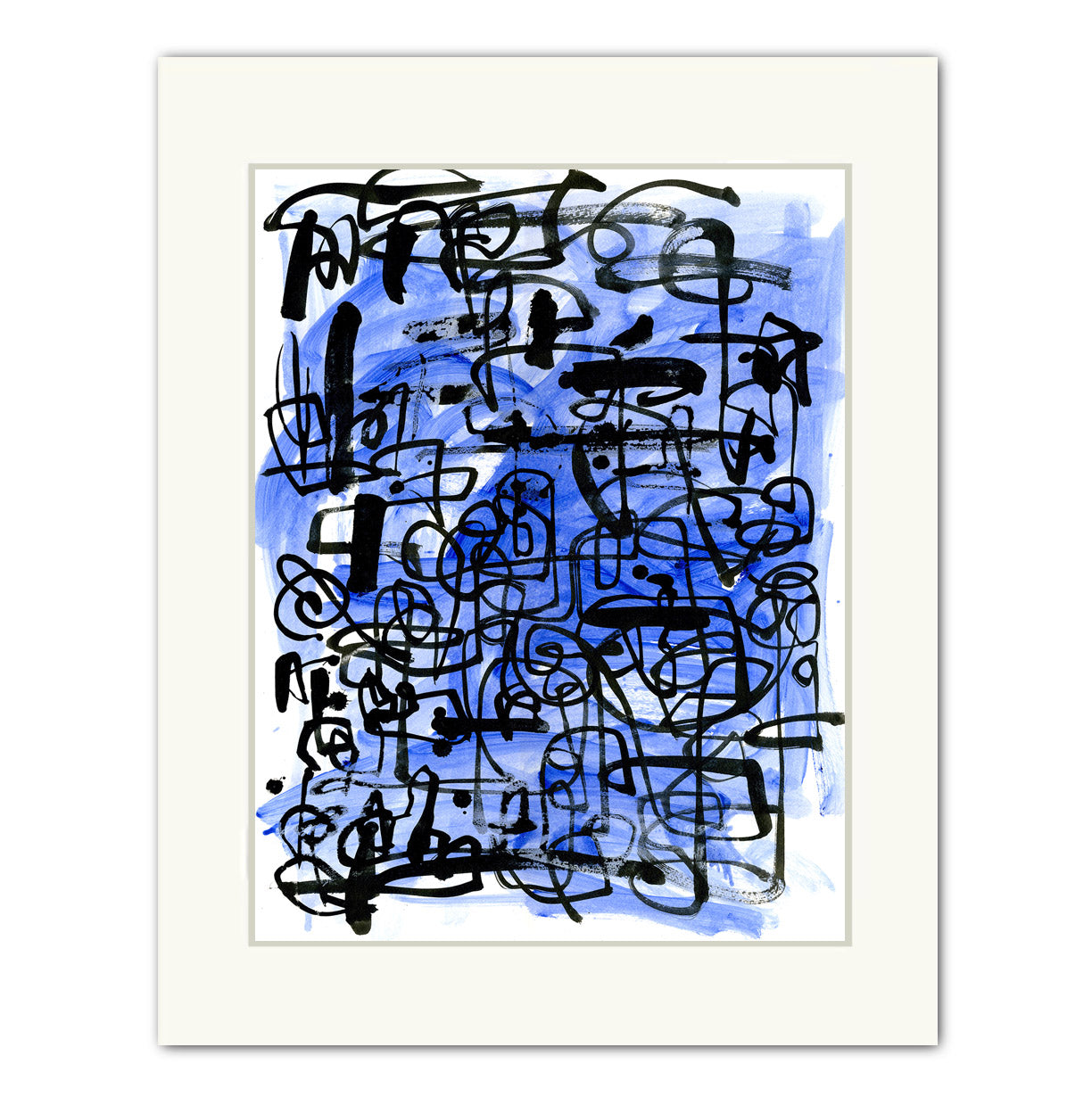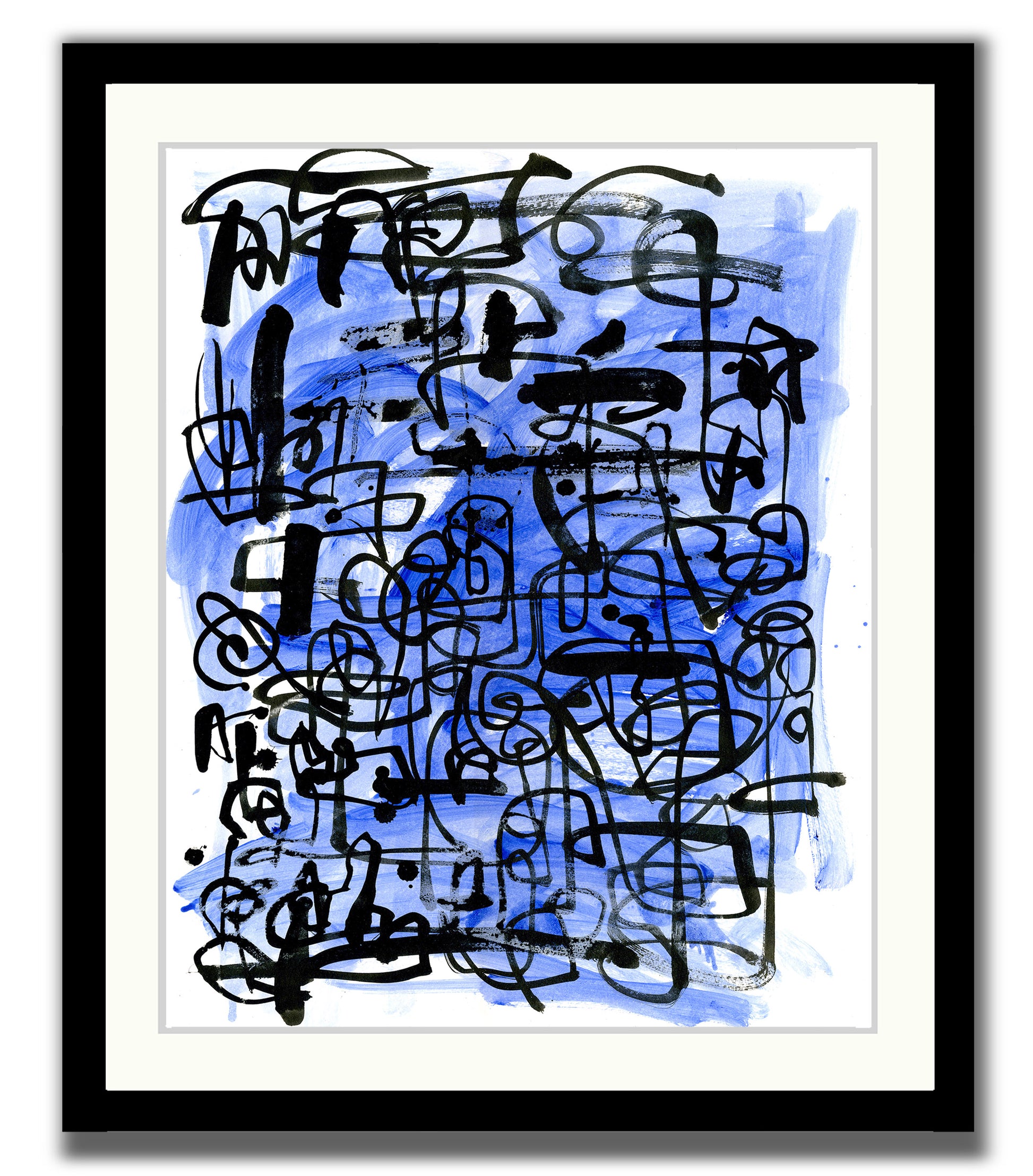 Looping spontaneous brush lines over blue oil wash. Printed on fine art paper or canvas, with each print personally signed. A contemporary wooden frame paired with non-reflective, shatterproof acrylic lends the piece a refined, museum-quality presentation. Made in USA.