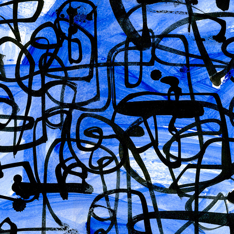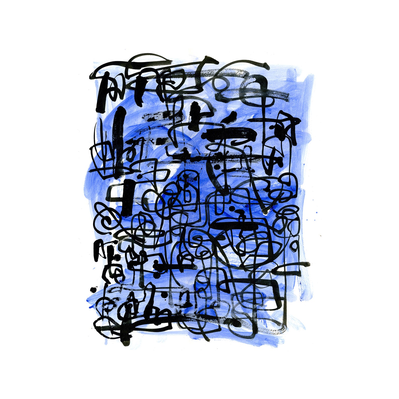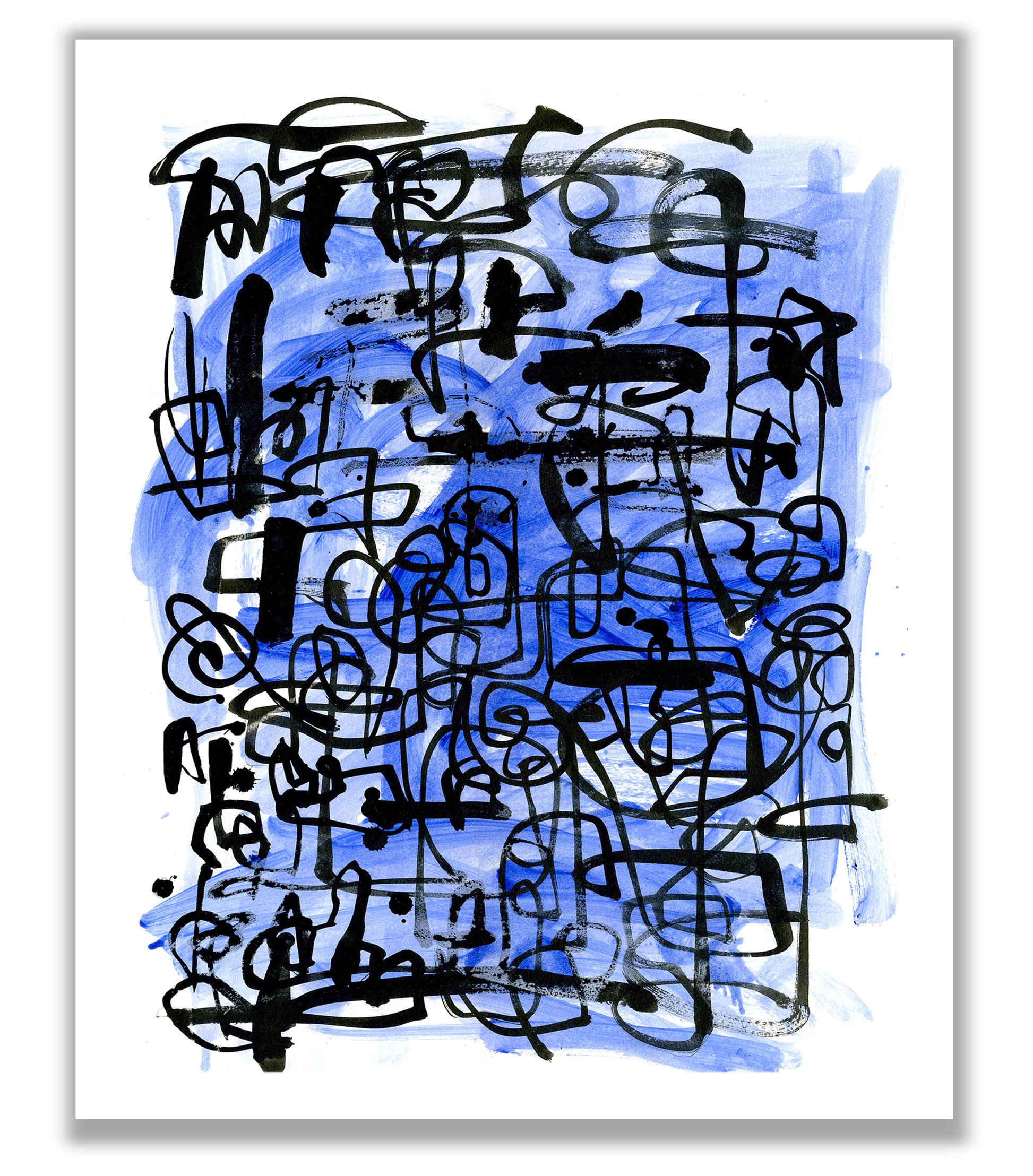 Looping spontaneous brush lines over blue oil wash. Printed on fine art paper or canvas, with each print personally signed. A contemporary wooden frame paired with non-reflective, shatterproof acrylic lends the piece a refined, museum-quality presentation. Made in USA.