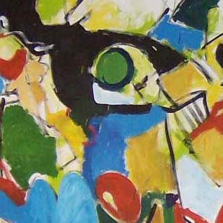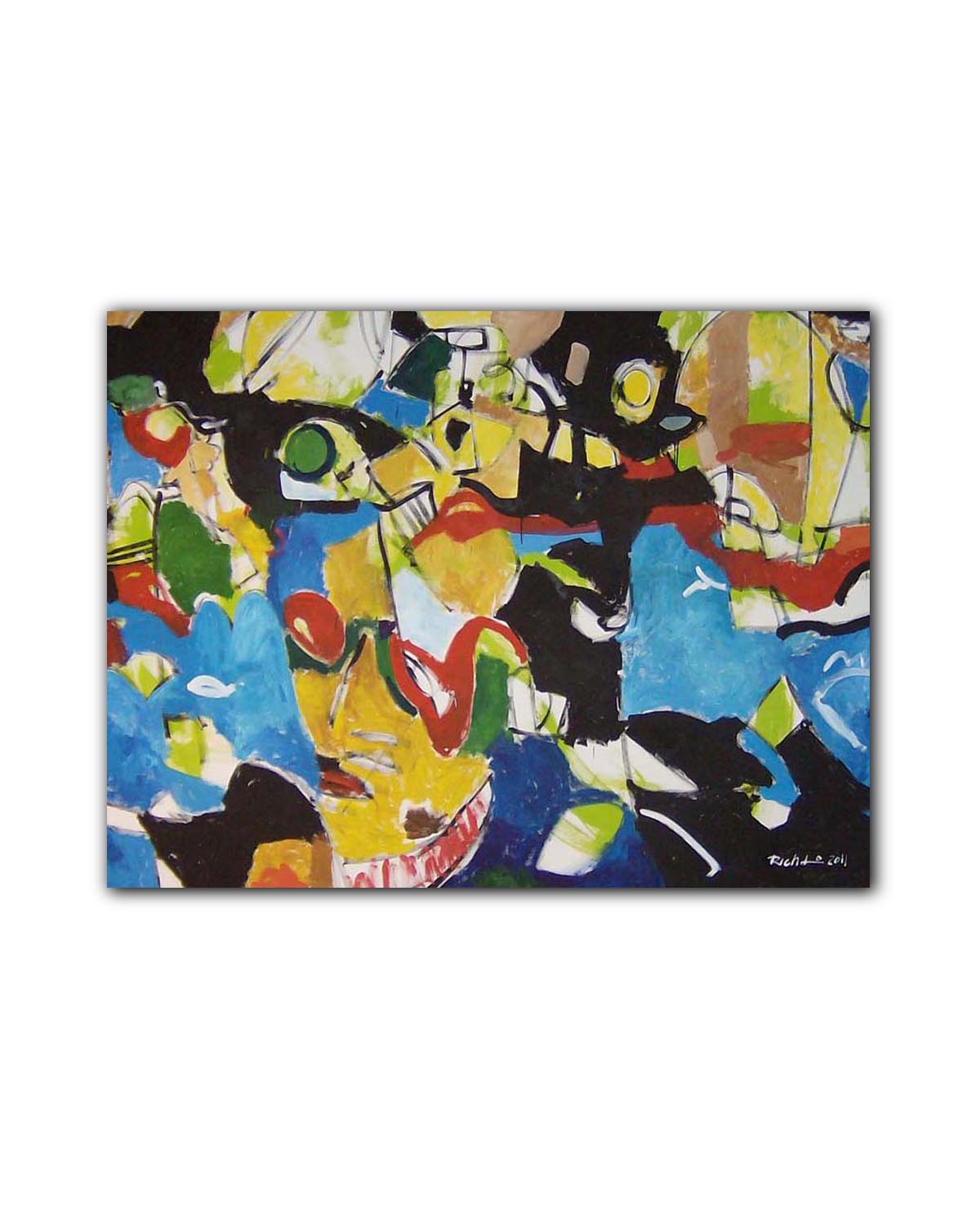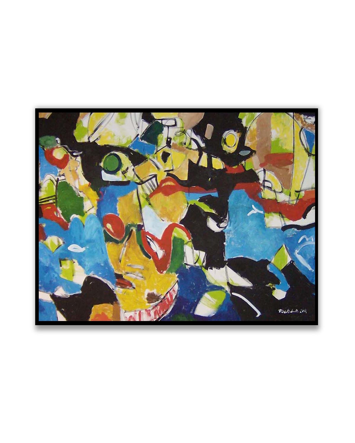This vibrant abstract oil painting titled "Masquerade" bursts with energy and color, creating a dynamic carnival-like atmosphere. The composition features bold, gestural brushstrokes in a riot of primary and secondary color, bright yellows, electric blues, vivid greens, and fiery reds. Dramatically anchored by heavy black linear elements that weave throughout the canvas.