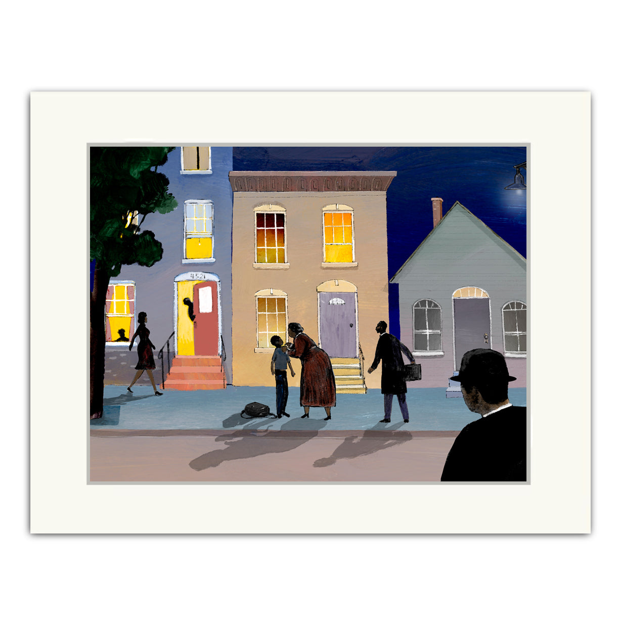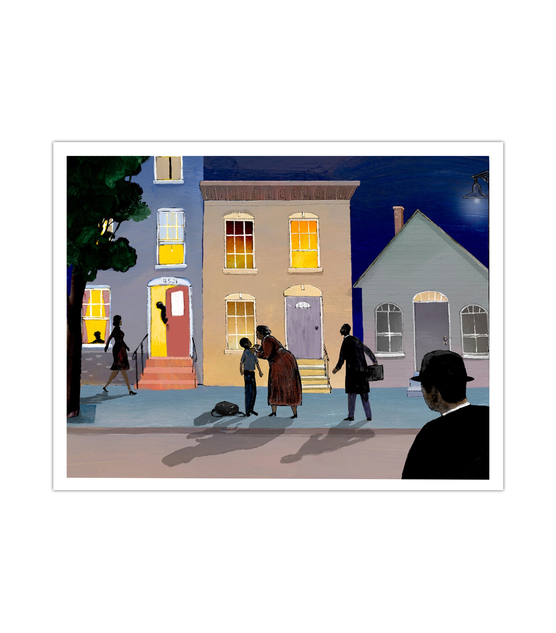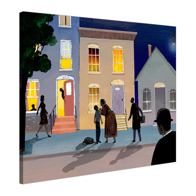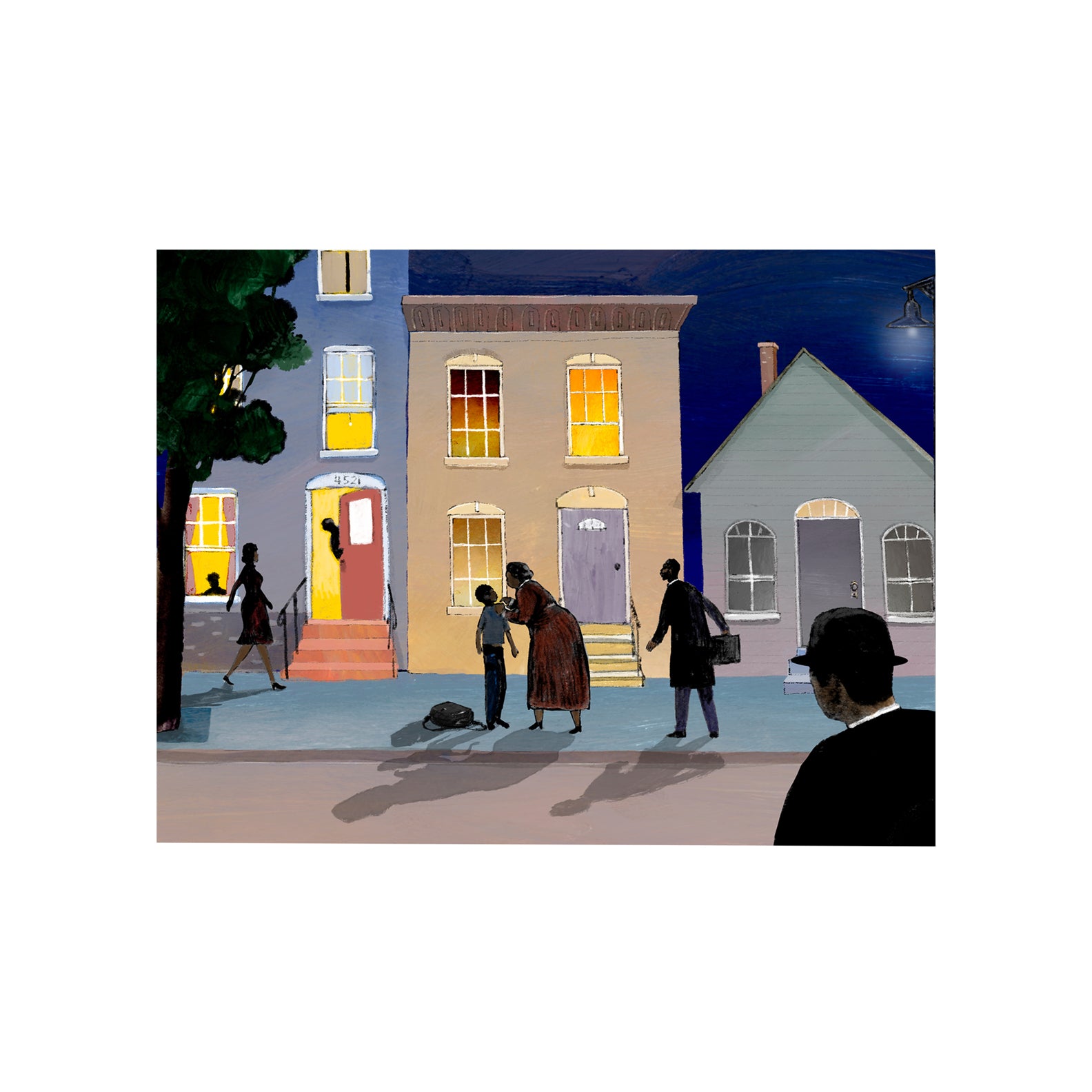 This evocative illustration captures the essence of the Harlem Renaissance era, depicting a nighttime street scene that reflects the vibrant cultural atmosphere of 1920s Harlem. The artwork shows a row of brownstone buildings typical of New York's Harlem neighborhood.
