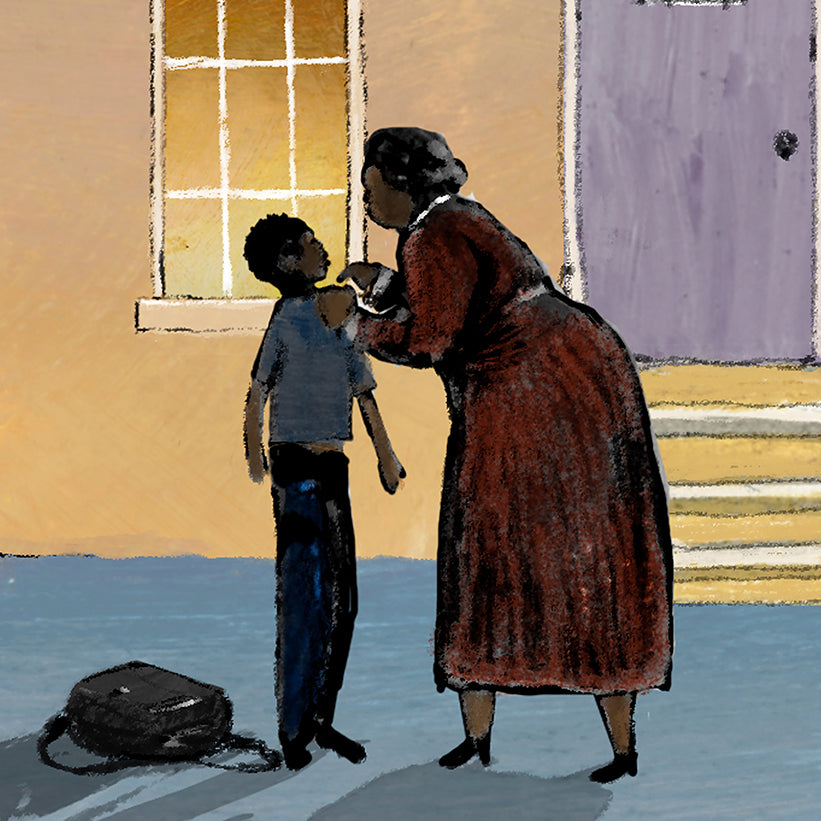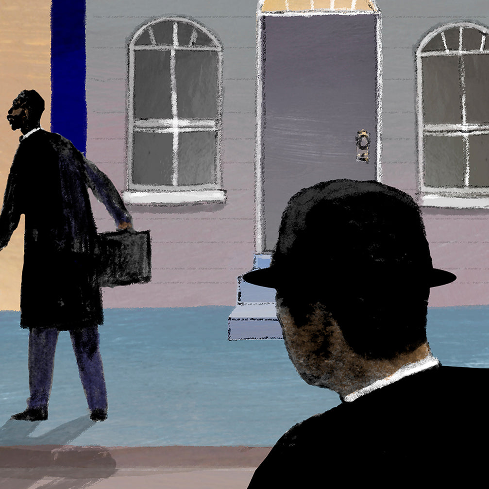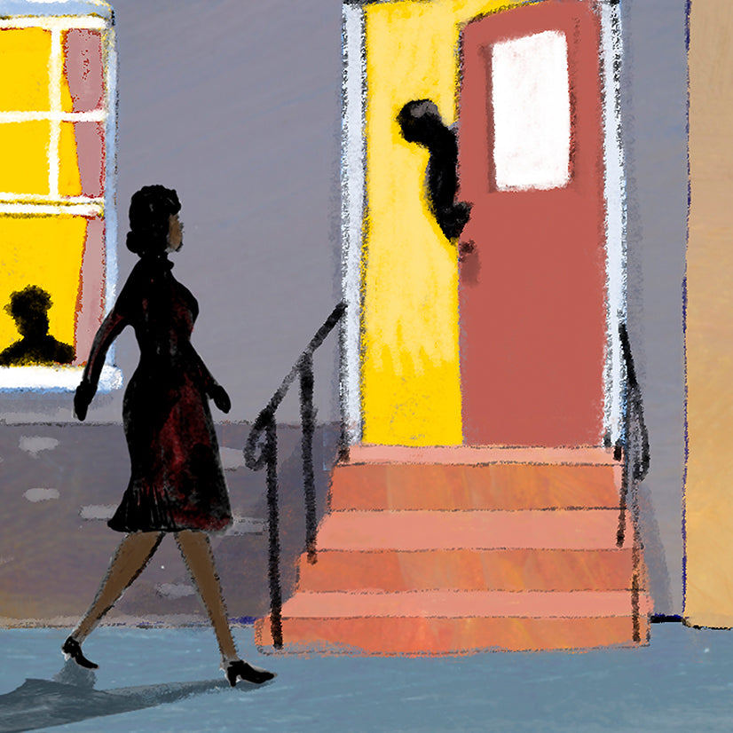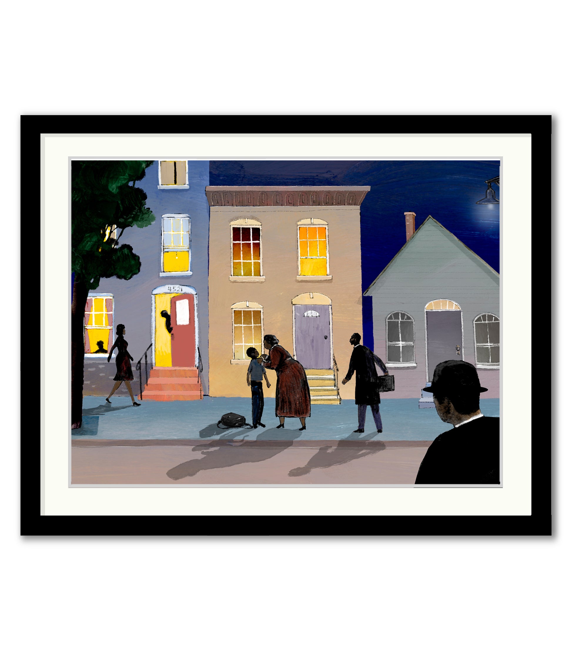 This evocative illustration captures the essence of the Harlem Renaissance era, depicting a nighttime street scene that reflects the vibrant cultural atmosphere of 1920s Harlem. The artwork shows a row of brownstone buildings typical of New York's Harlem neighborhood.