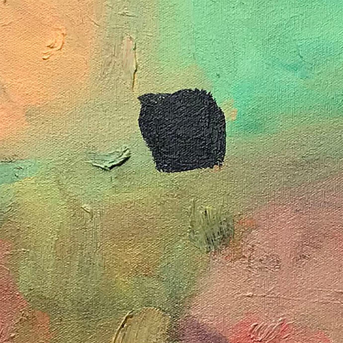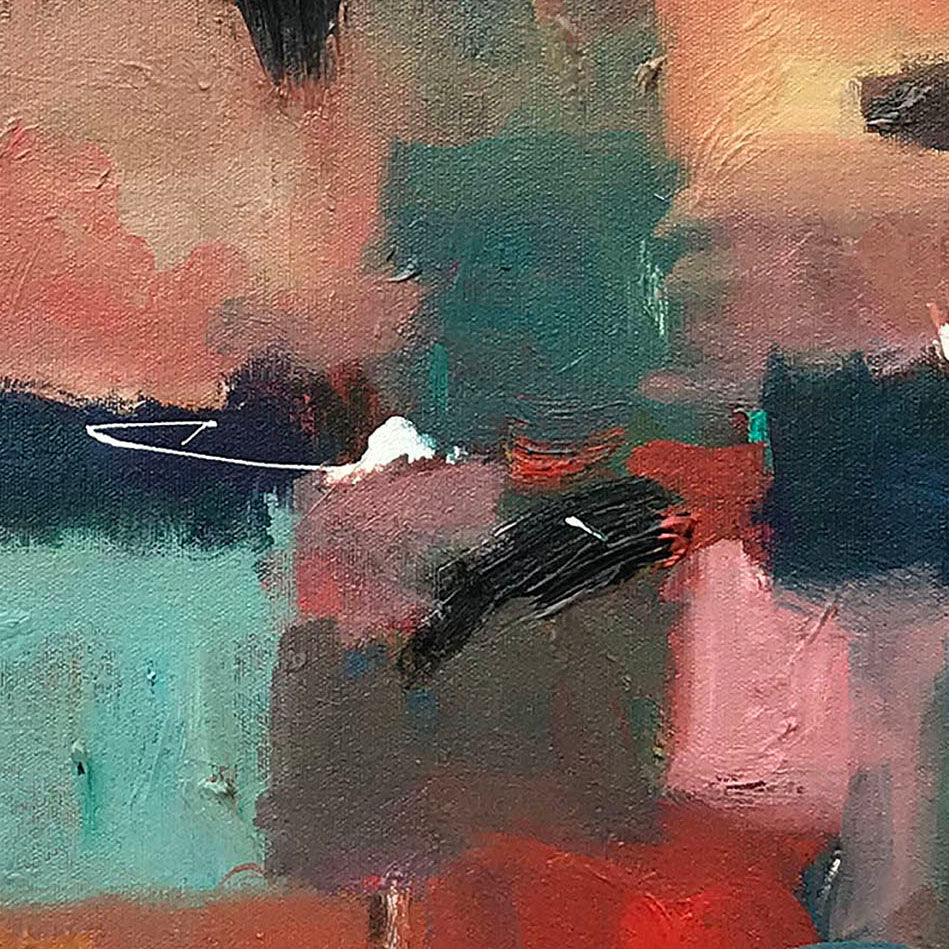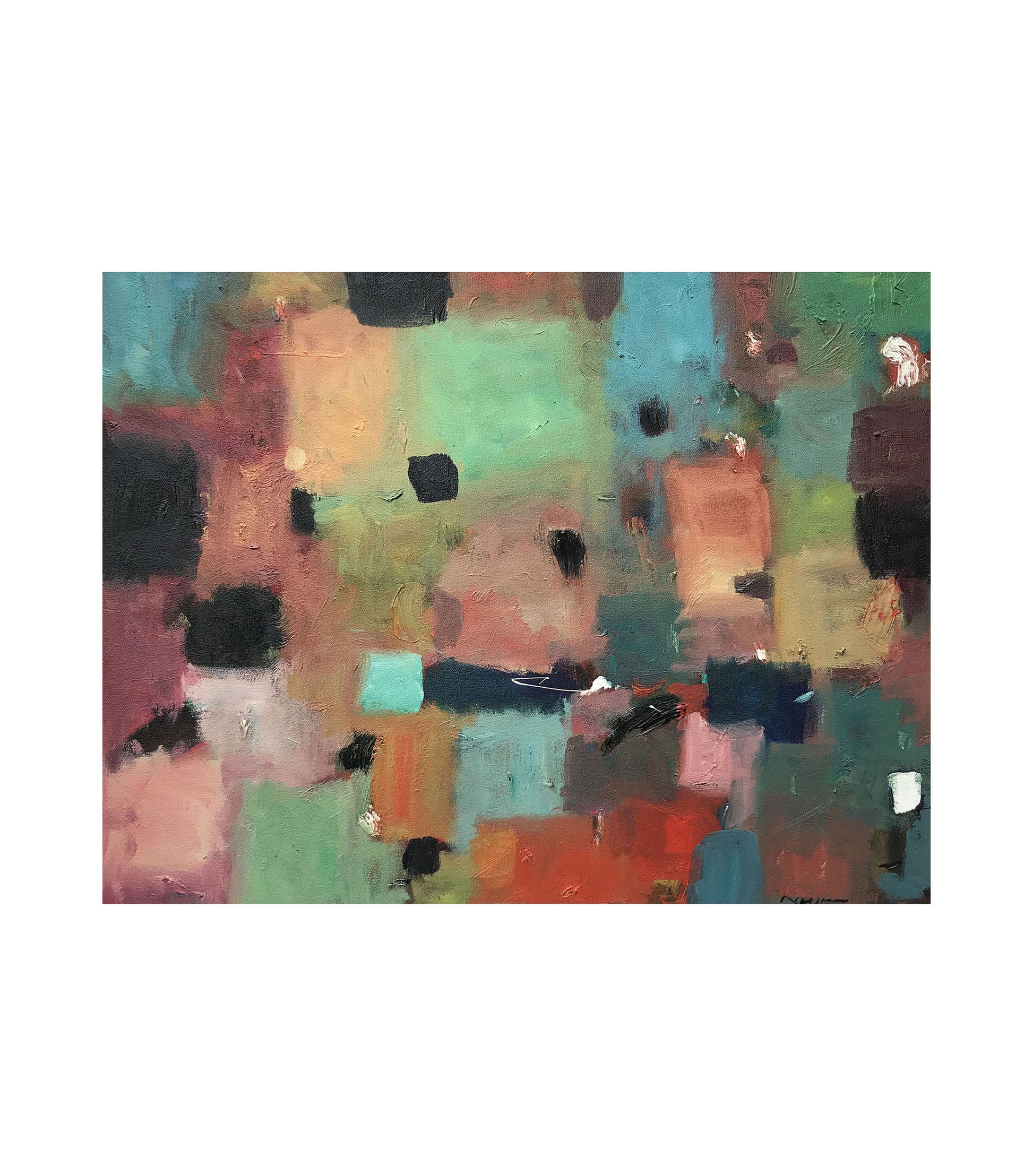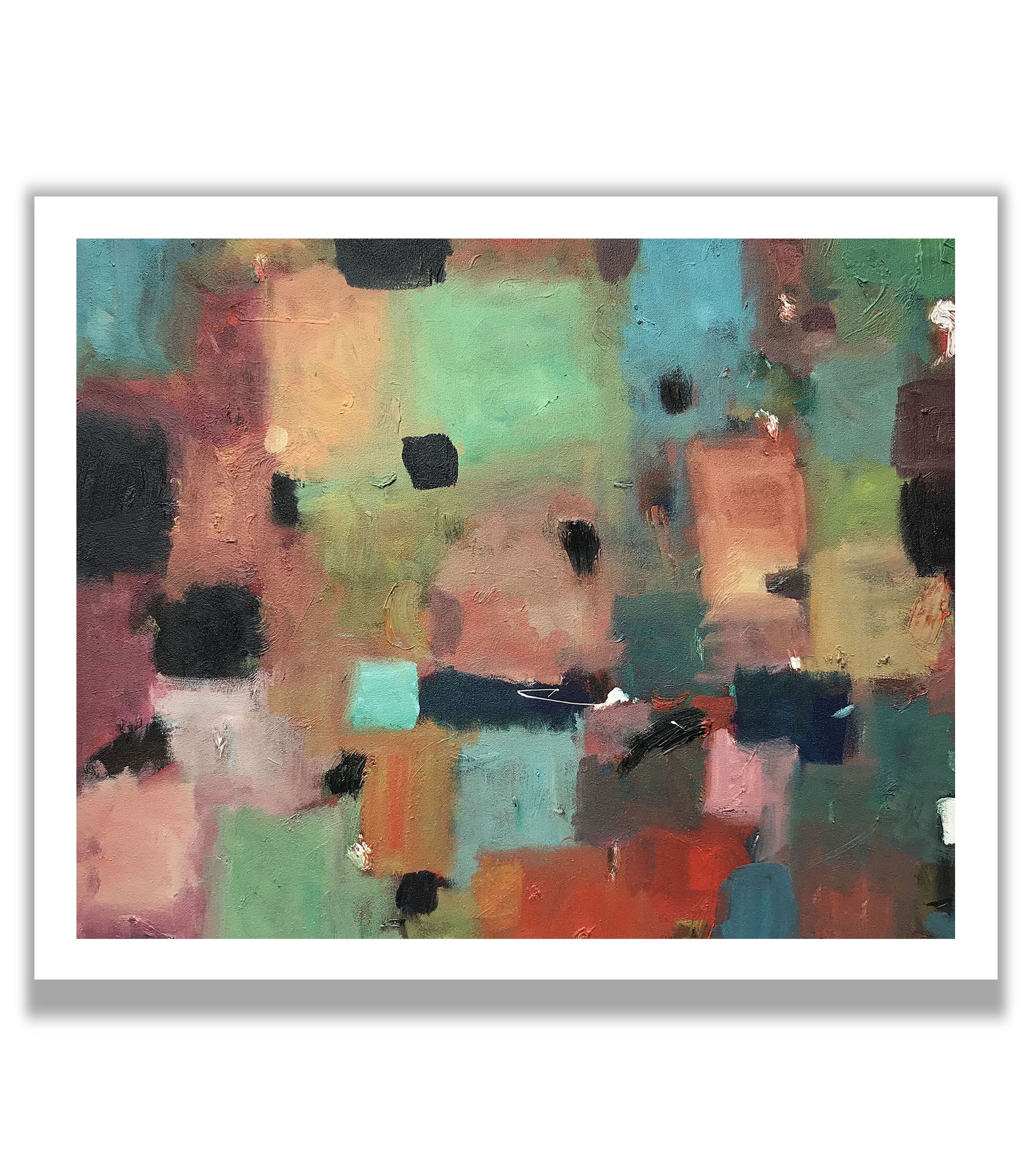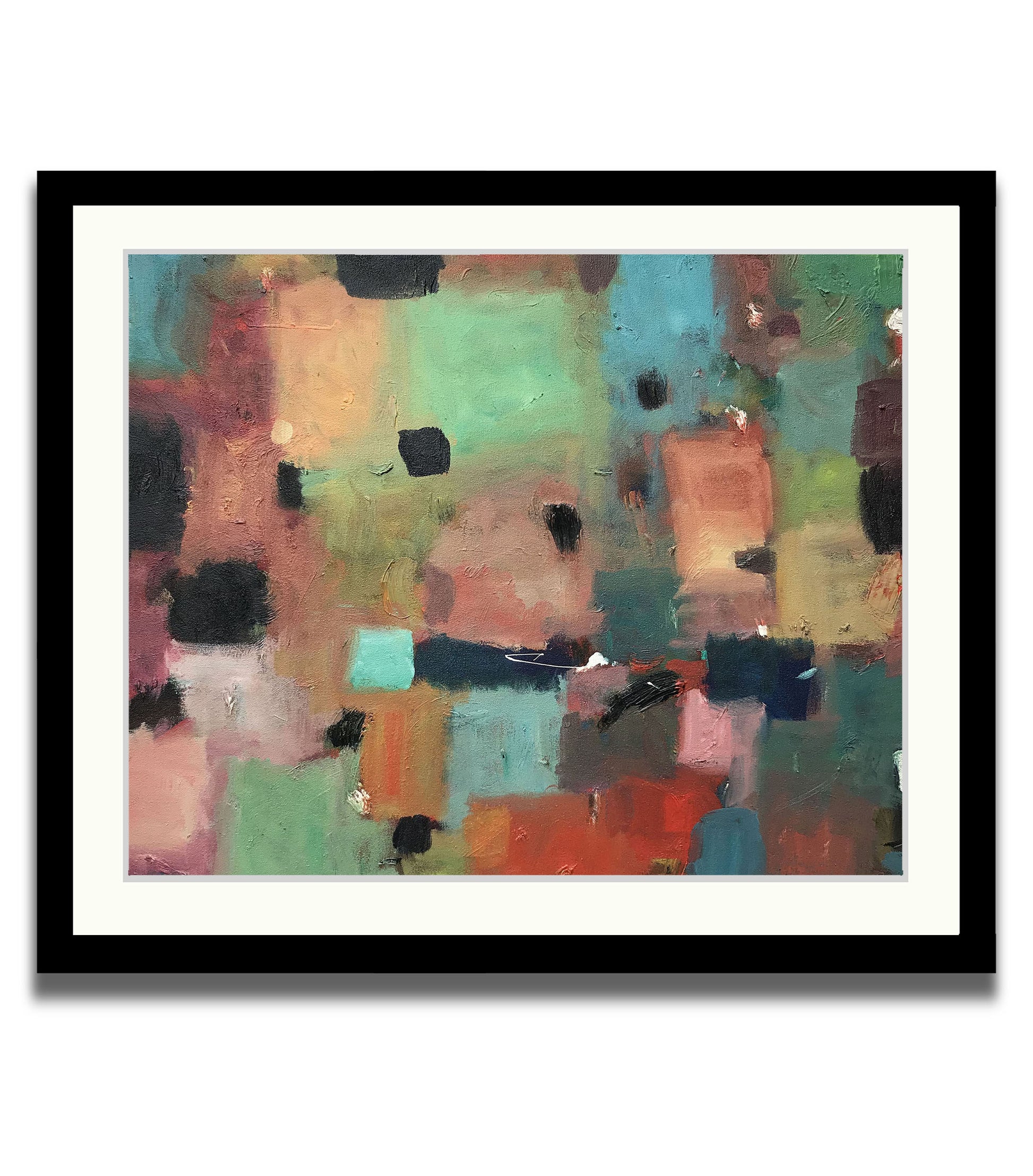 This painting evokes the energy and rhythm of a bustling urban landscape. It’s composed of layered, blocky forms in a dynamic arrangement, reminiscent of city blocks or architectural structures viewed from above or in motion. The painting uses a rich, warm palette such as rusty reds, earthy browns, deep teal, vibrant turquoise, soft peach, and olive green punctuated by bold black squares and textured brushstrokes. Printed on fine art paper and canvas, with each print personally signed. A contemporary wooden frame paired with non-reflective, shatterproof acrylic lends the piece a refined, museum-quality presentation. Made in USA.