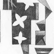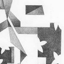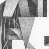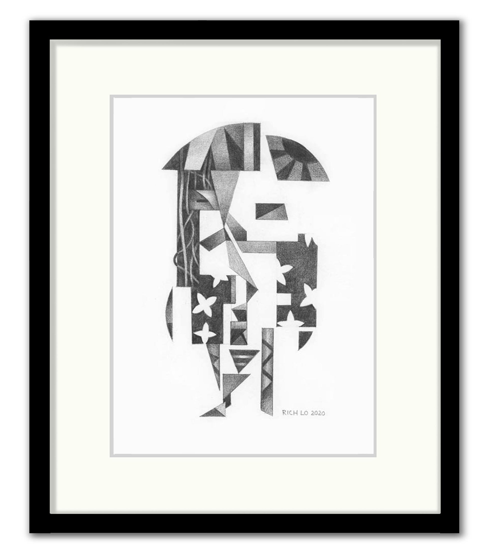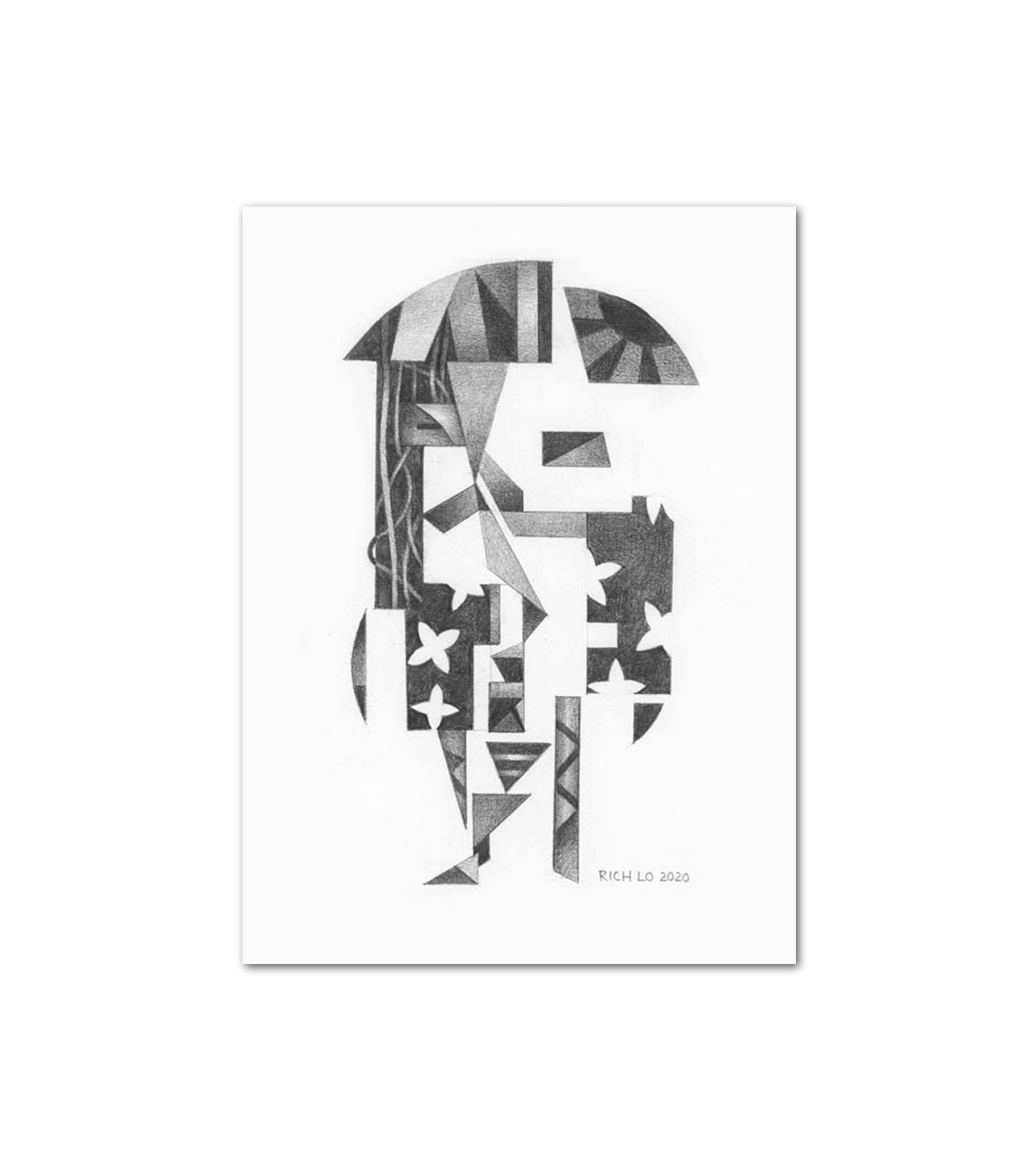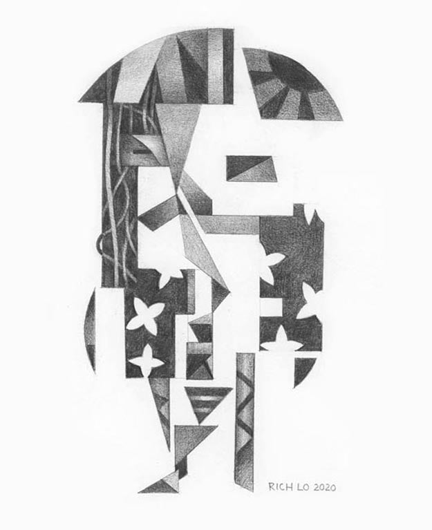 This is a striking pencil drawing that presents a highly stylized, abstract interpretation of a figure or portrait. The composition is built around a central form that suggests a head and upper torso, but rendered through the Rich's signature geometric fragmentation technique. The drawing features a complex arrangement of angular shapes, patterns, and contrasting tonal values. The upper portion of the composition contains curved and angular elements that represent hair or headwear, while the central area is broken into various geometric segments with different textures and patterns.