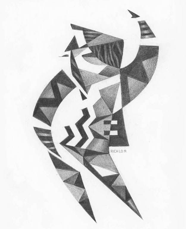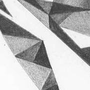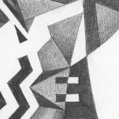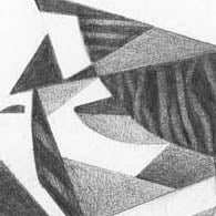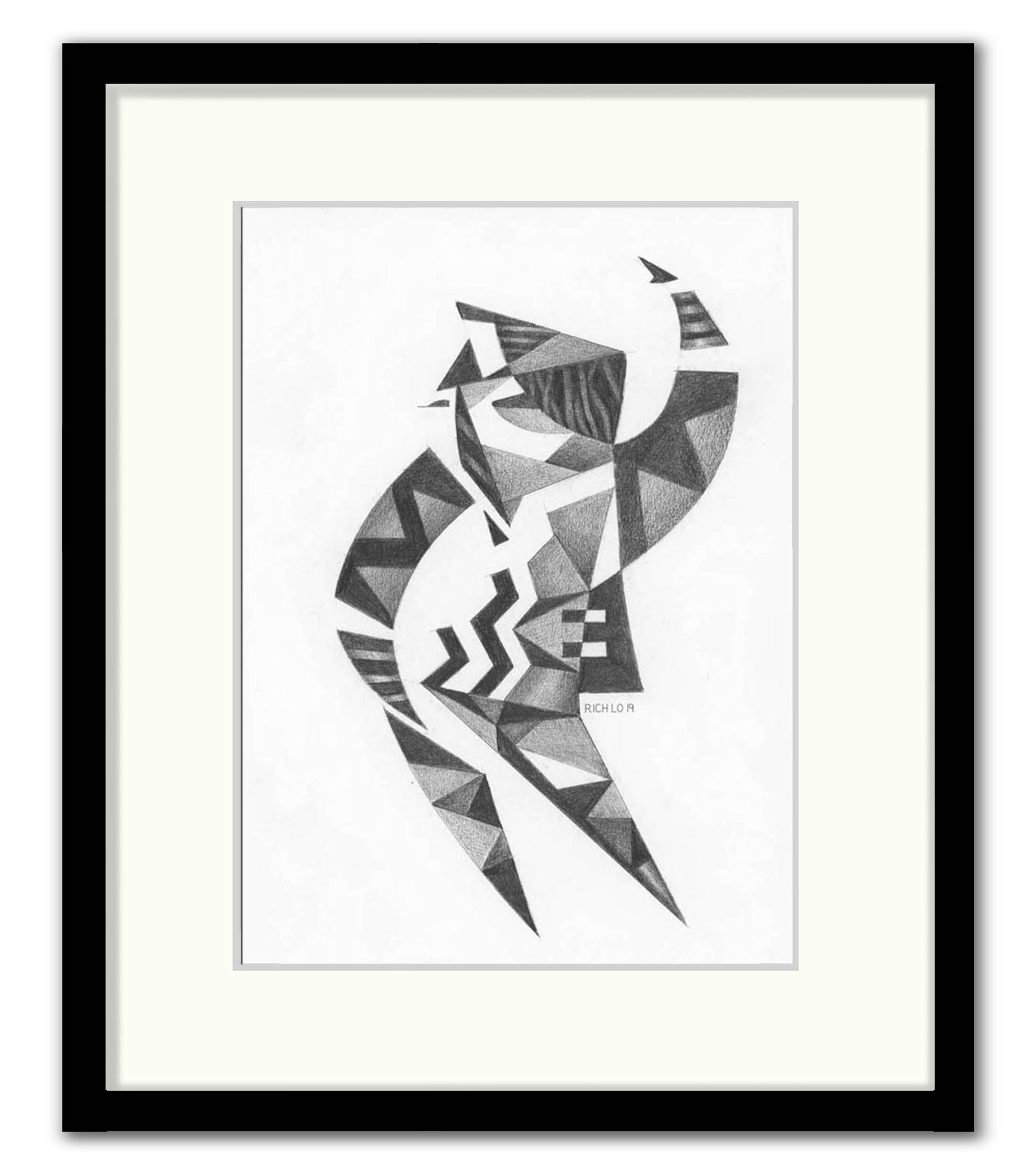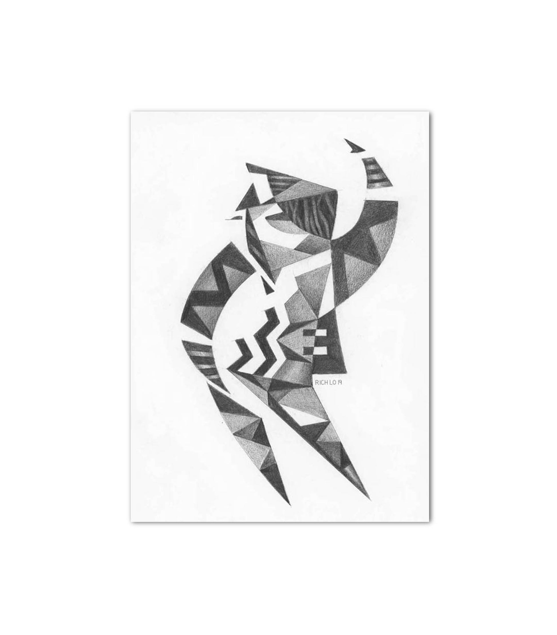 Ms Disco is a pencil drawing that captures the energy and movement of disco culture through his geometric fragmentation technique. The composition suggests a dancing figure in motion, constructed from interlocking angular shapes and flowing curved elements that convey the rhythmic, kinetic energy of dance. The figure appears to be mid-dance move, with the geometric fragments arranged to suggest the classic poses and flowing movements associated with disco dancing. Curved ribbon-like elements weave through the composition, possibly representing flowing hair, fabric, or the continuous movement of dance itself. These flowing forms contrast dynamically with the sharp, angular geometric pieces.