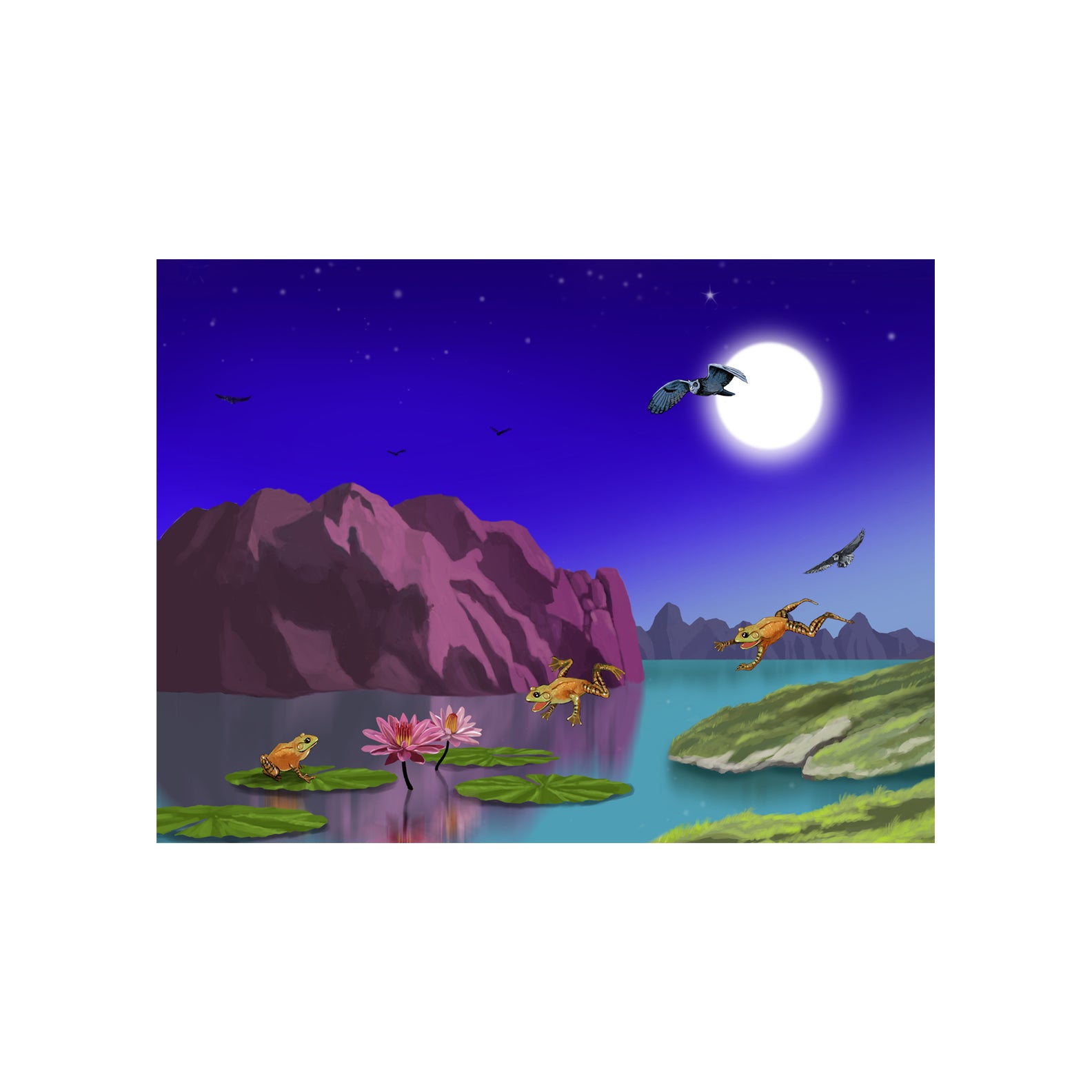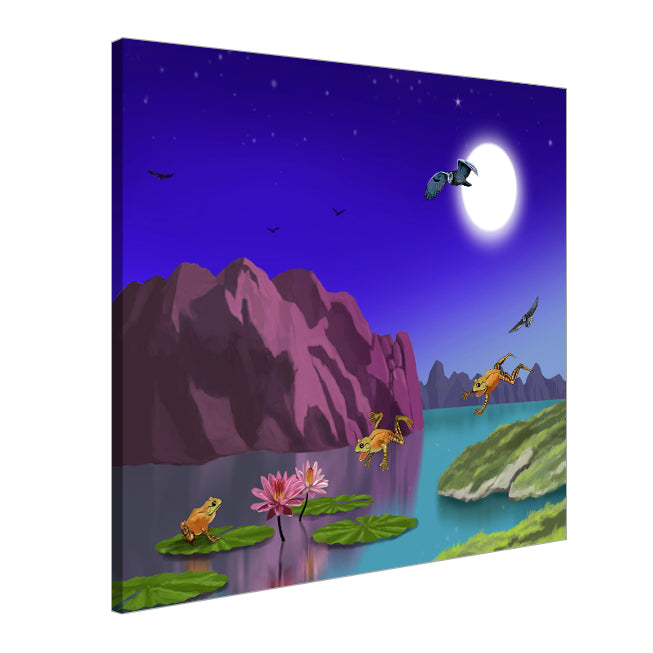 Mystery Lake depicts a serene nocturnal scene filled with magical atmosphere. The composition centers around a tranquil lake that reflects the dramatic landscape surrounding it.