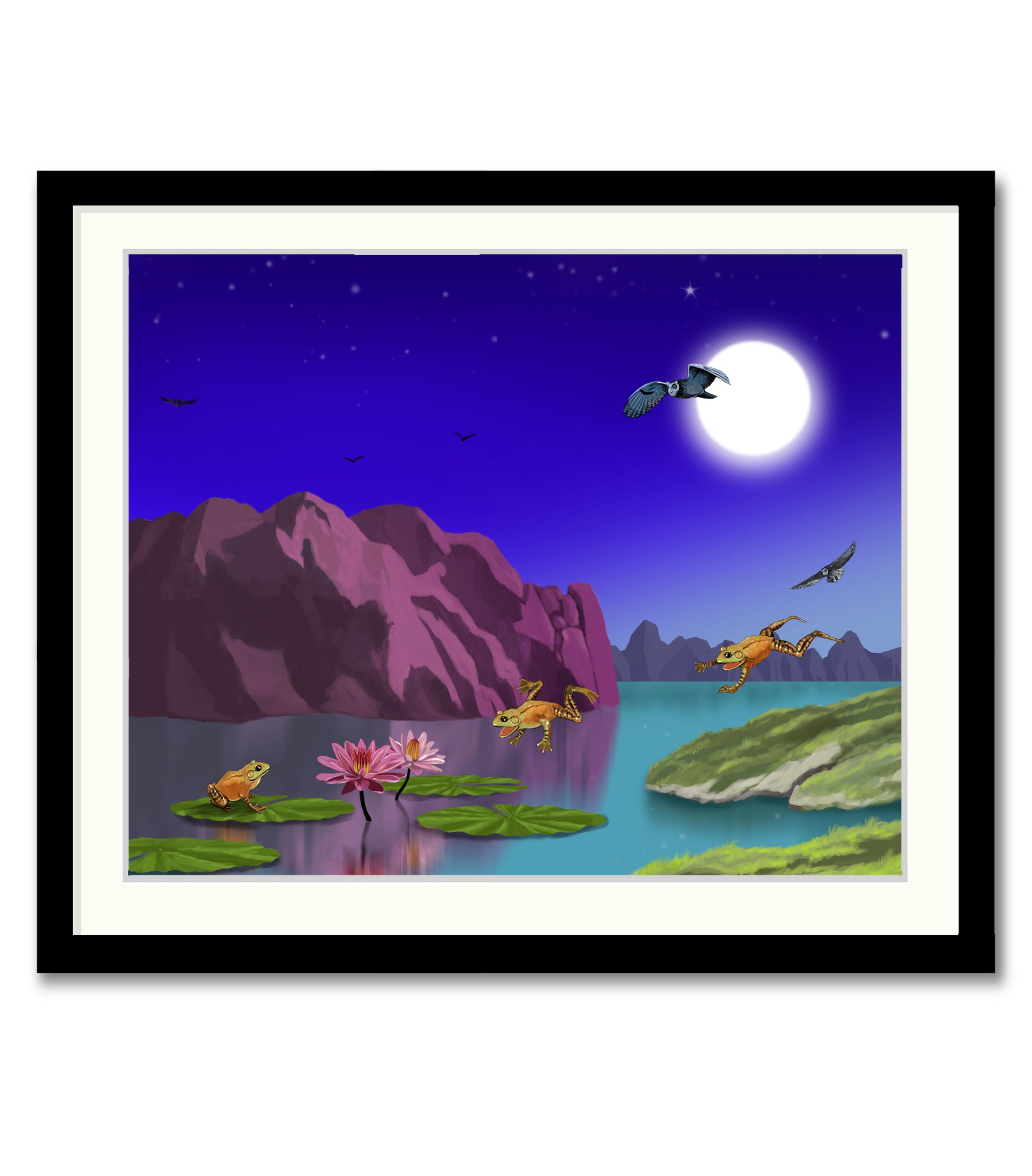 Sizes 16"X20" and 22"X28" contemporary wooden frame paired with non-reflective, shatterproof acrylic lends the piece a refined, museum-quality presentation. Size 11X14 frame pairs with regular glass. Hand-made in the USA.