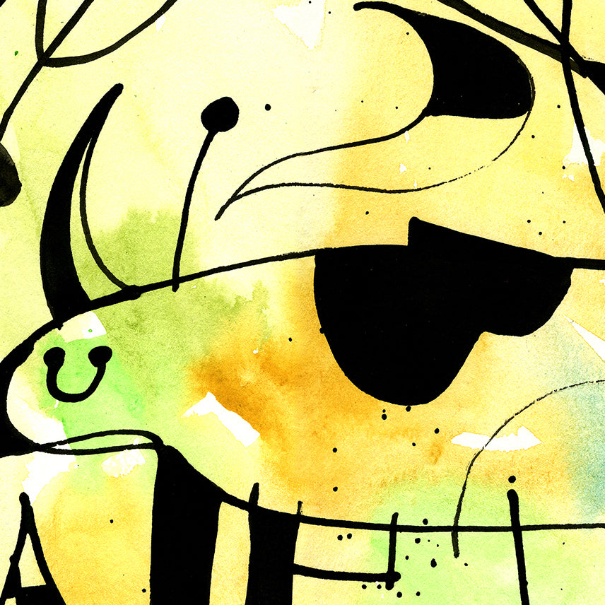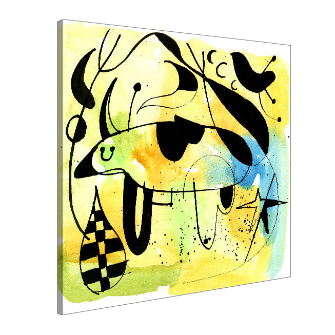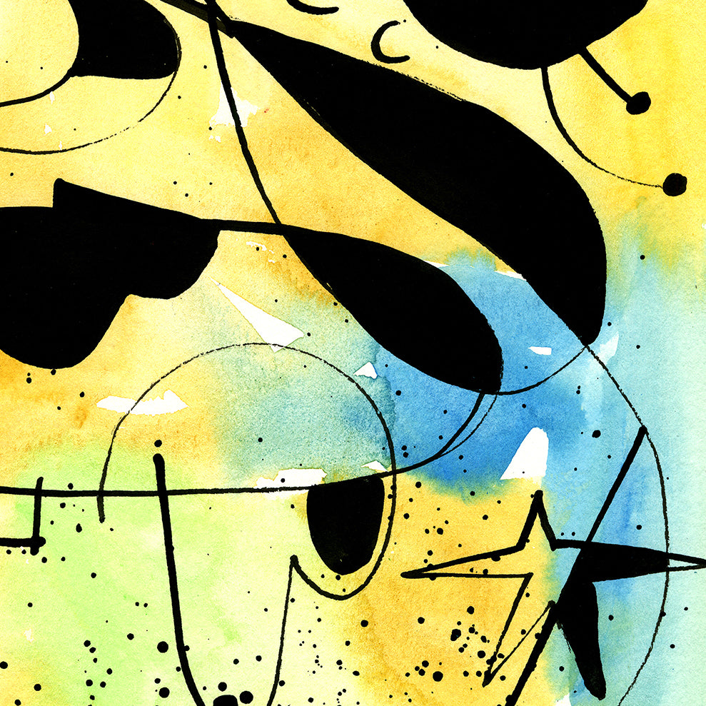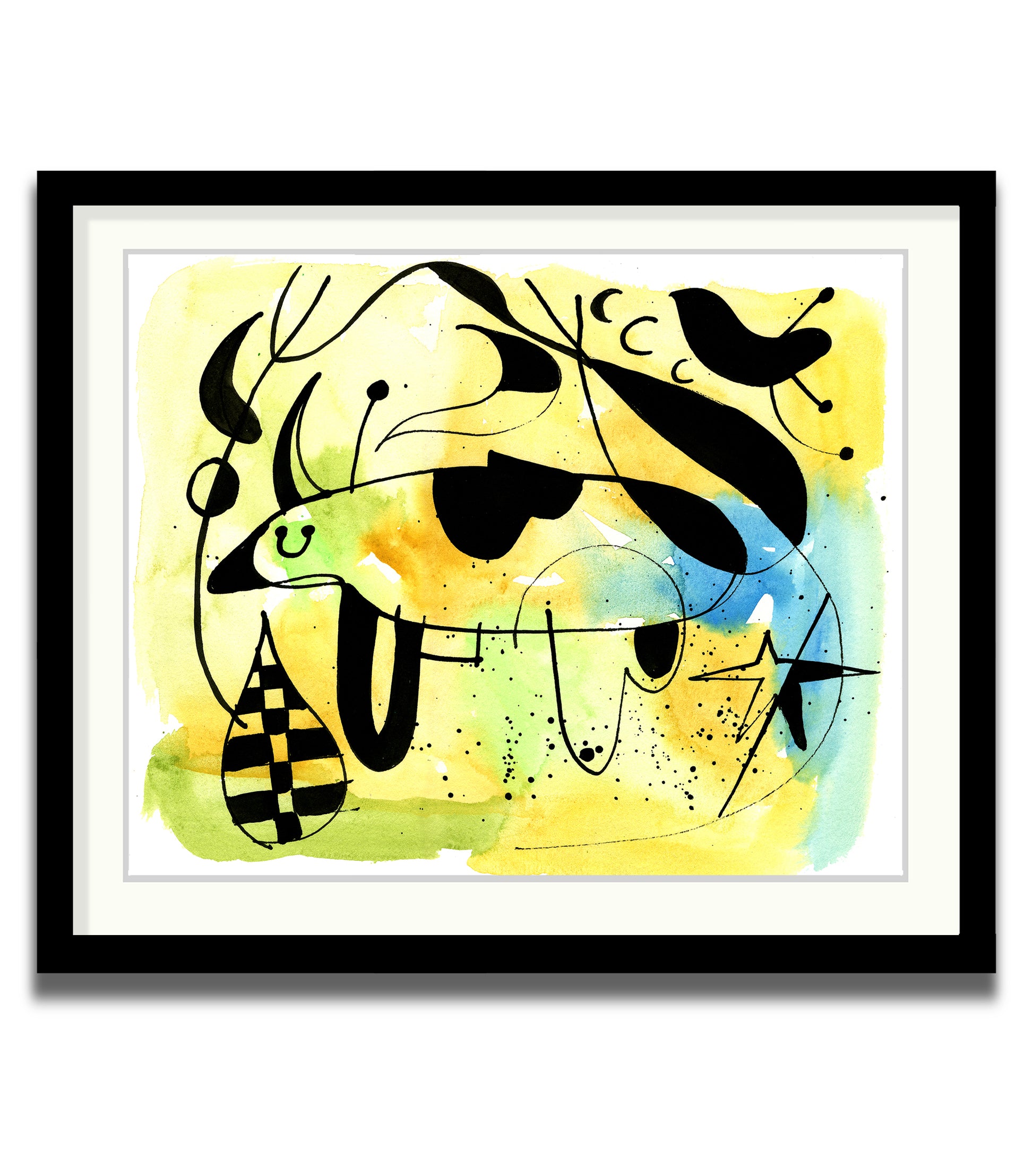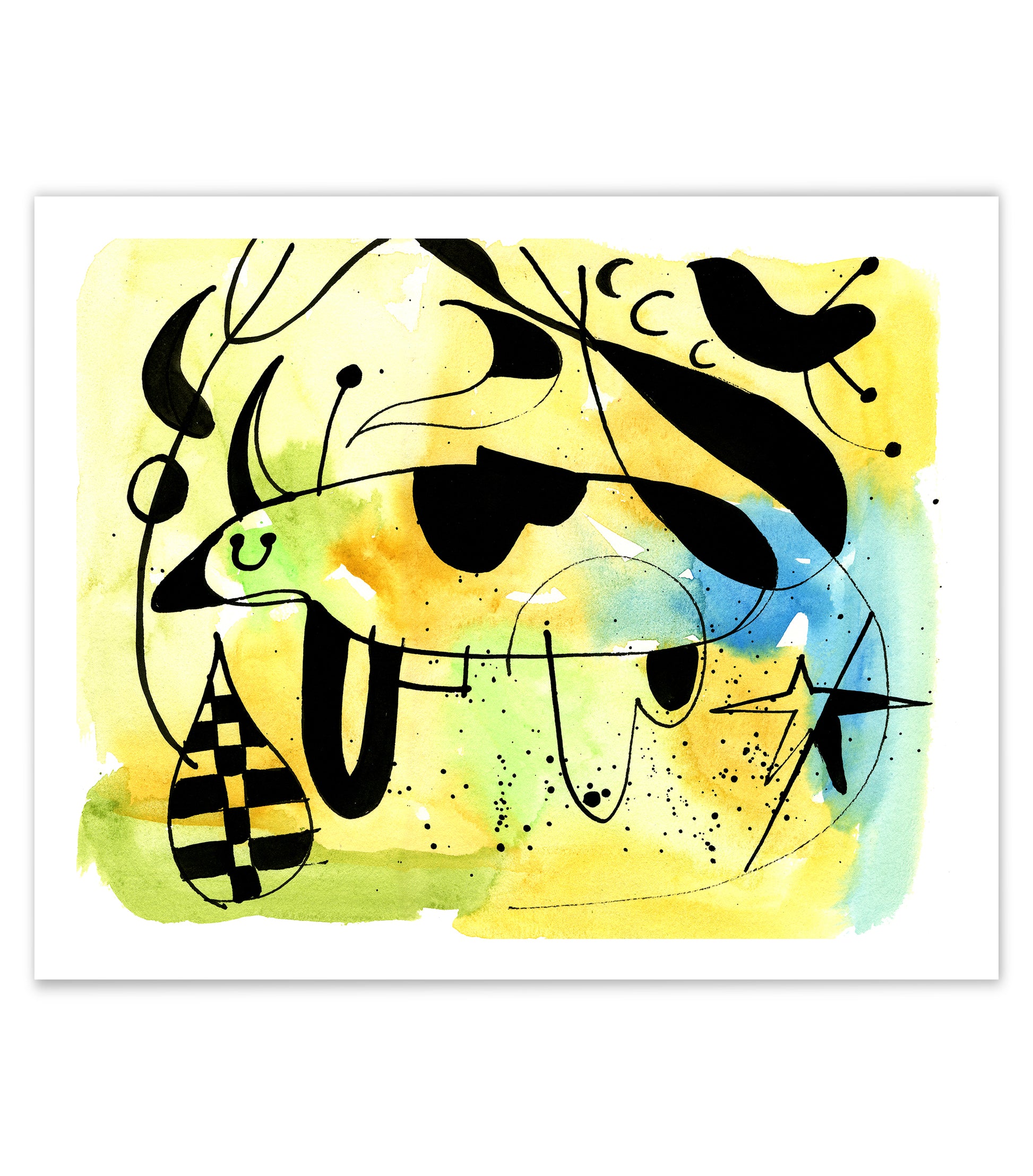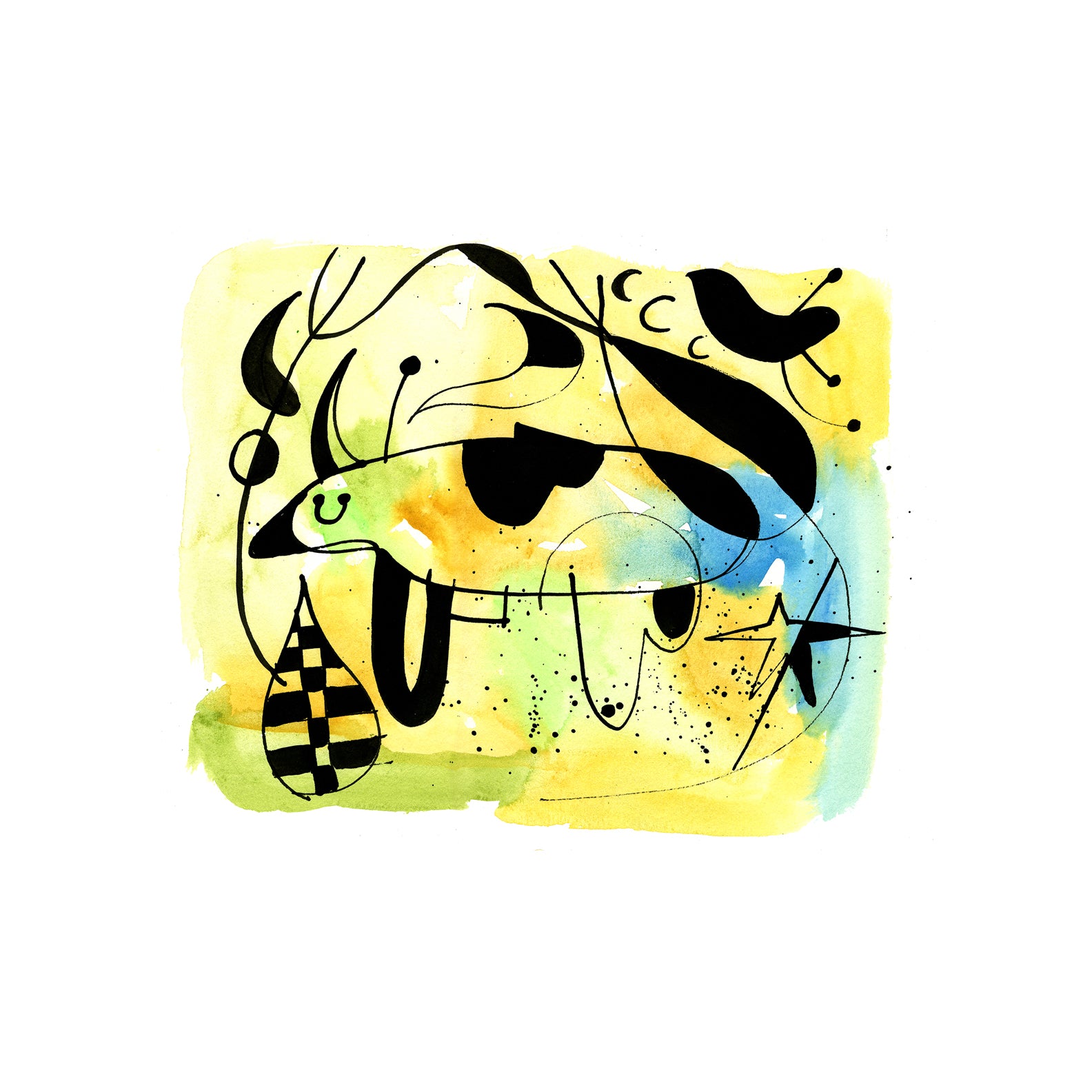 The artwork Mystery of a 3-legged Cow is a whimsical and imaginative piece that blends humor with abstraction. Using bold black lines over bright washes of watercolor, the image suggests the form of a cow, but with a playful twist—it has only three legs. The unusual detail turns the animal into a puzzle, inviting viewers to pause, smile, and wonder. The mix of strong graphic lines and free-flowing color creates a lively, dreamlike quality. The painting feels less about realism and more about curiosity, surprise, and the joy of seeing the world in unexpected ways.