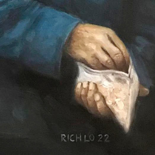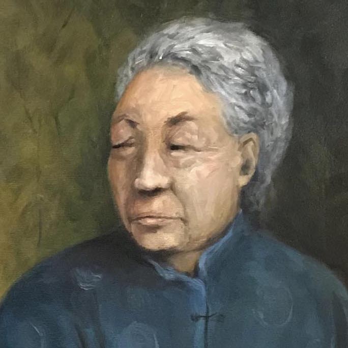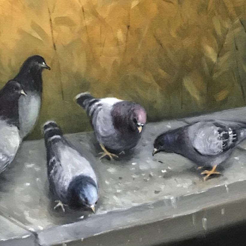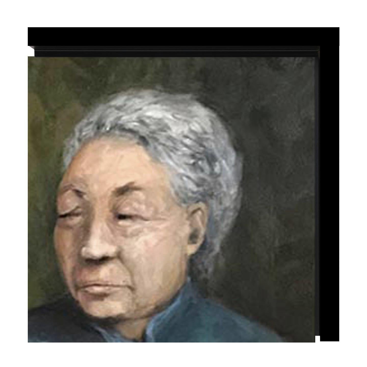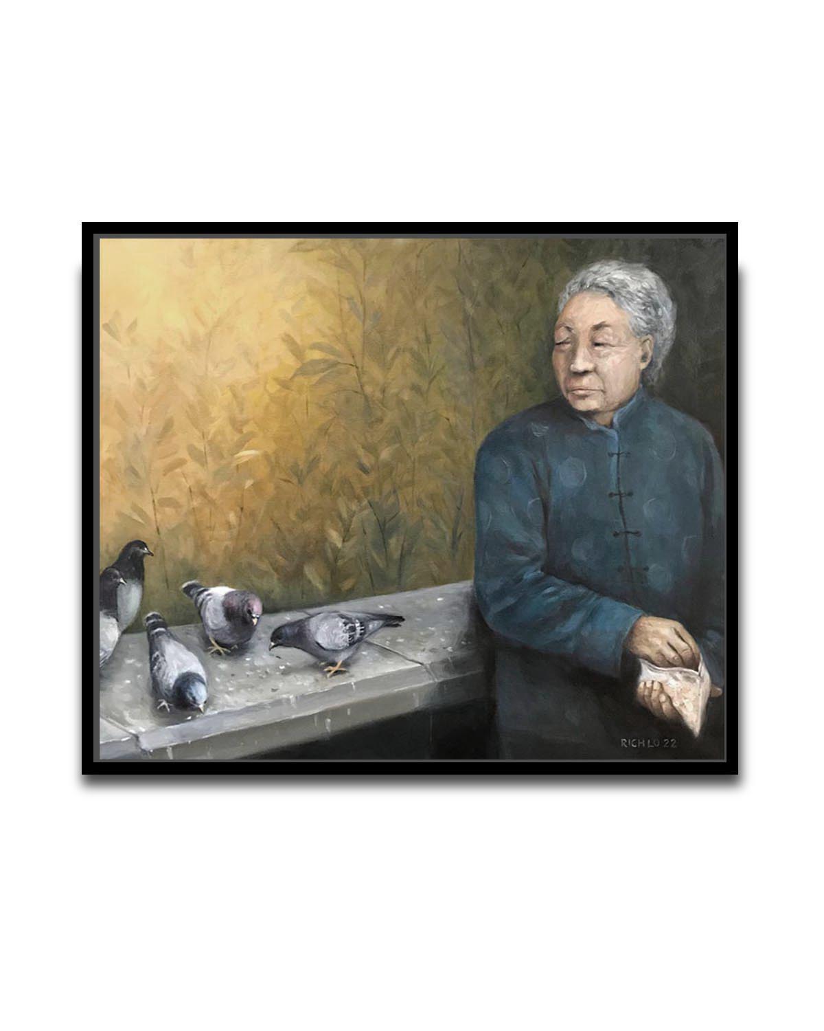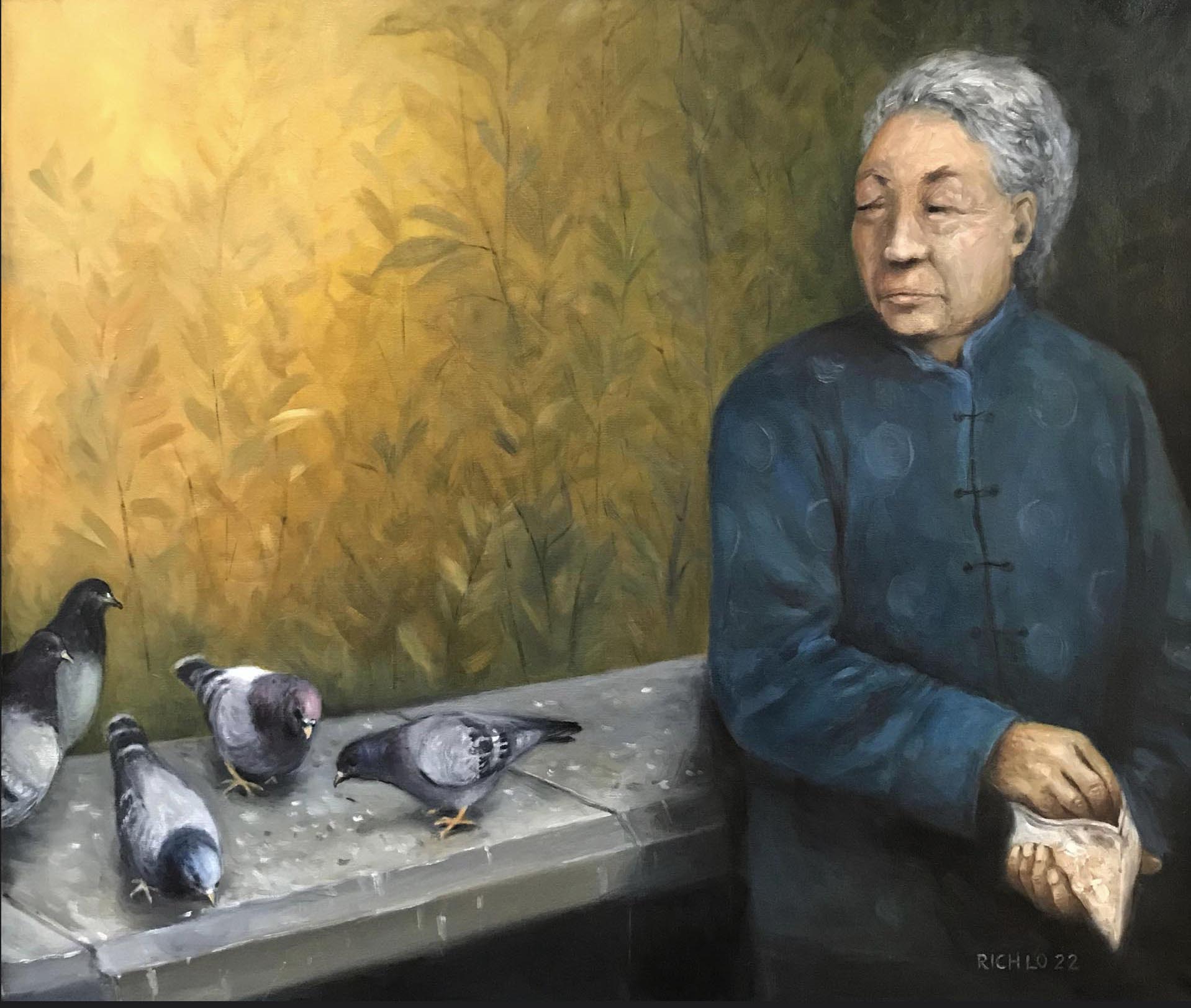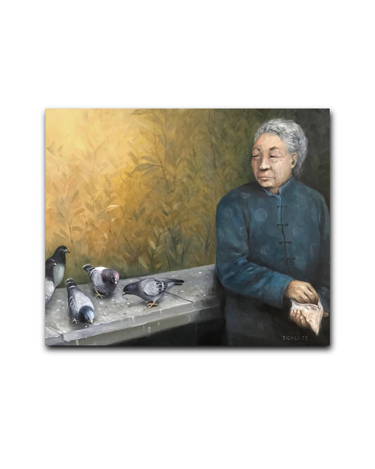 This is a contemplative and beautifully rendered oil painting that captures a quiet moment of connection between an elderly Asian woman and a group of pigeons.