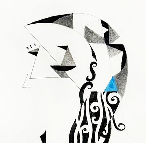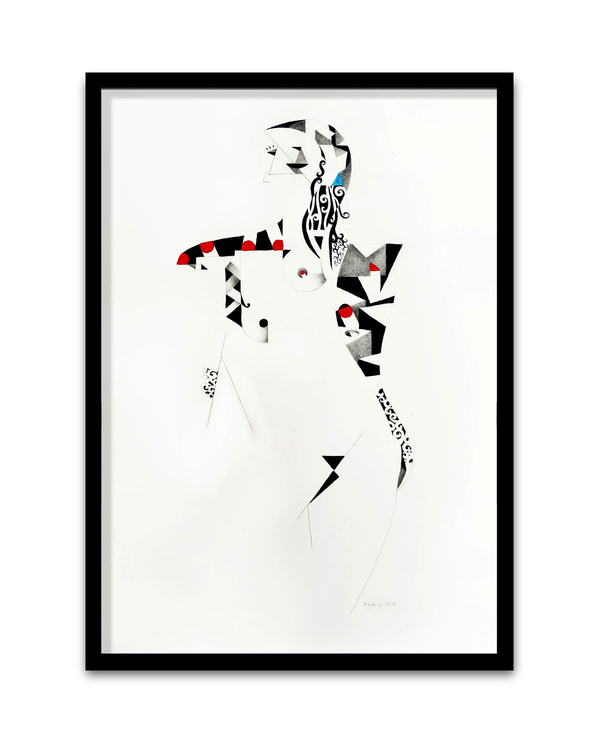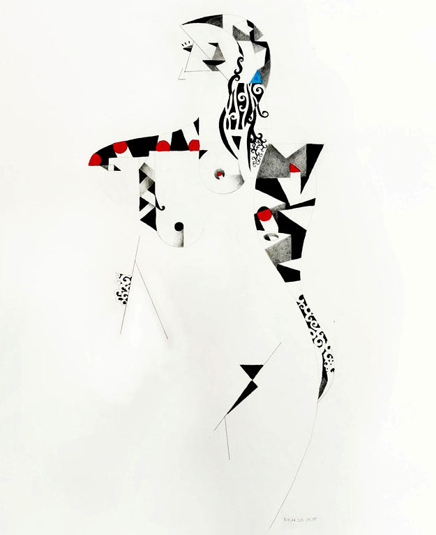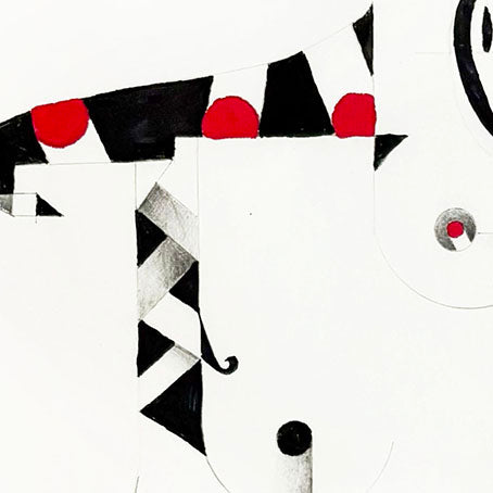 The artwork depicts a female figure in profile, constructed entirely from geometric fragments in black, white, and gray tones, with strategic pops of red and a small touch of blue. The red accents are particularly effective, appearing to highlight elements like jewelry, lips, or clothing details, adding drama and luxury to the monochromatic base. The careful placement of these color elements draws the eye and creates focal points within the fragmented form. This work uses the collage technique as both medium and metaphor - the fractured nature represent the complexity of identity, the multifaceted nature of social personas.