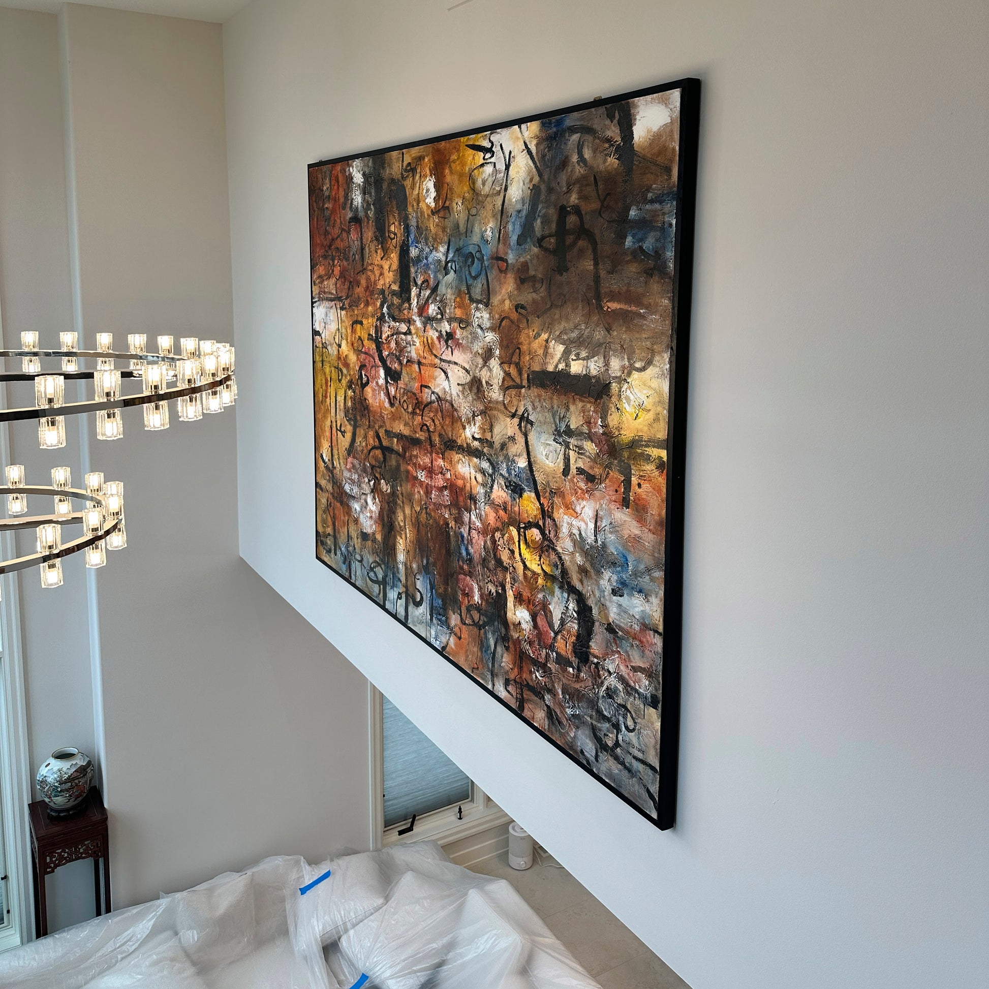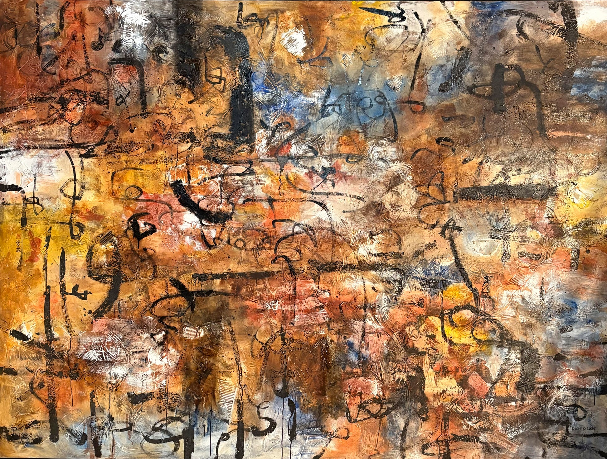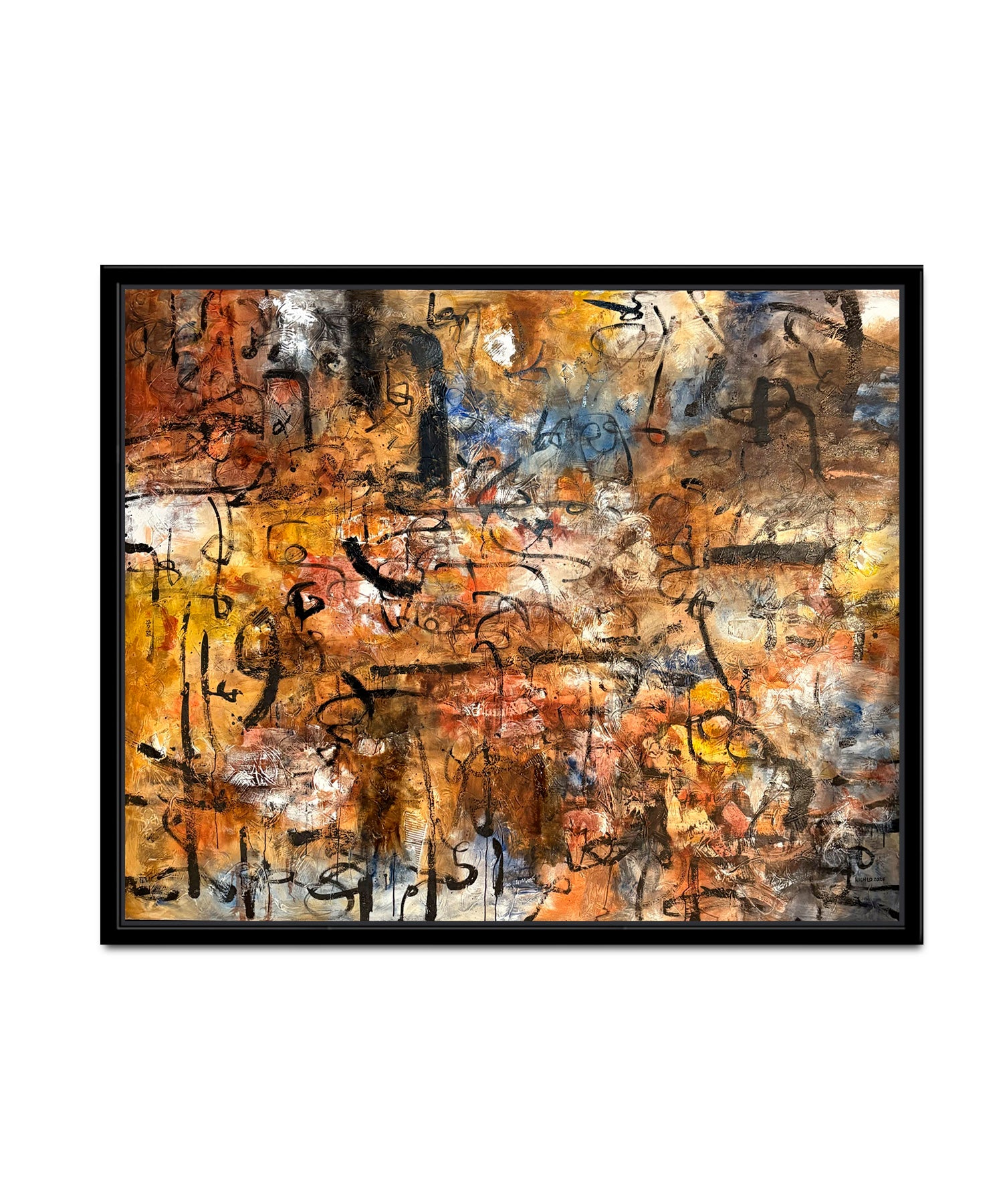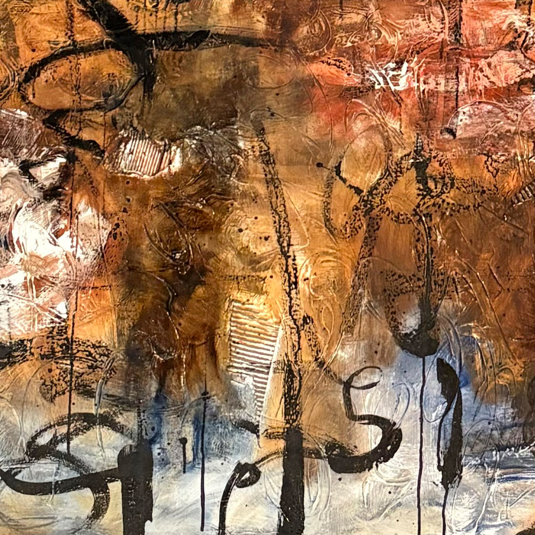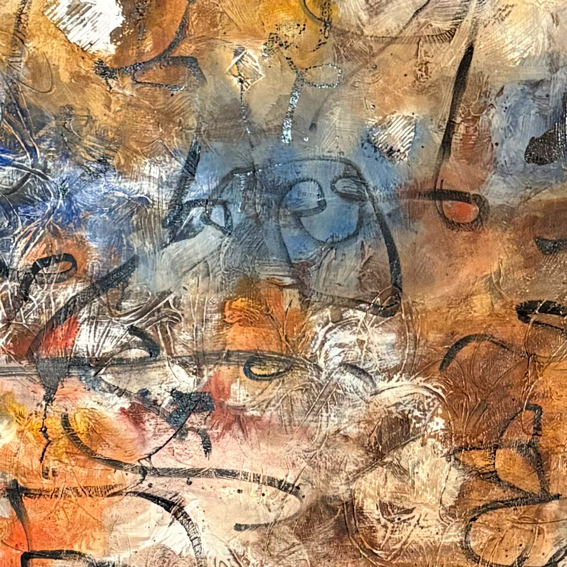 Original art. Abstract expressive composition of strokes, lines and texture. Medium: Oil, ink and glued material on canvas.