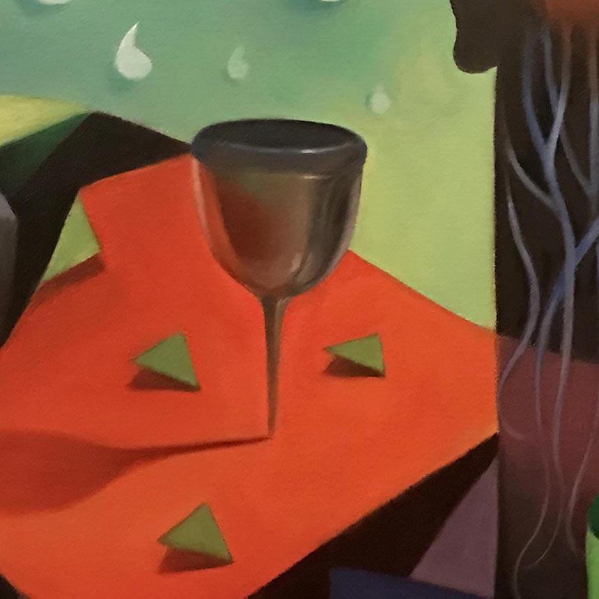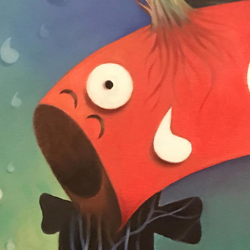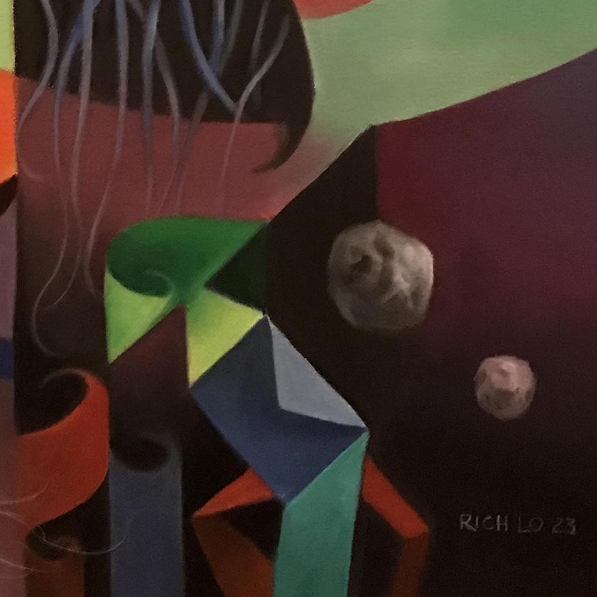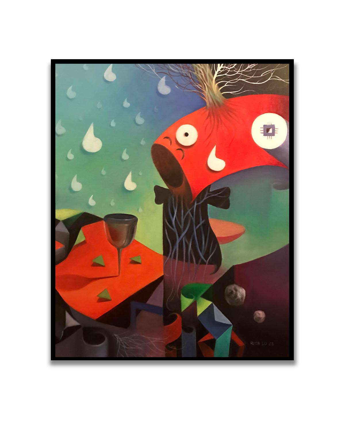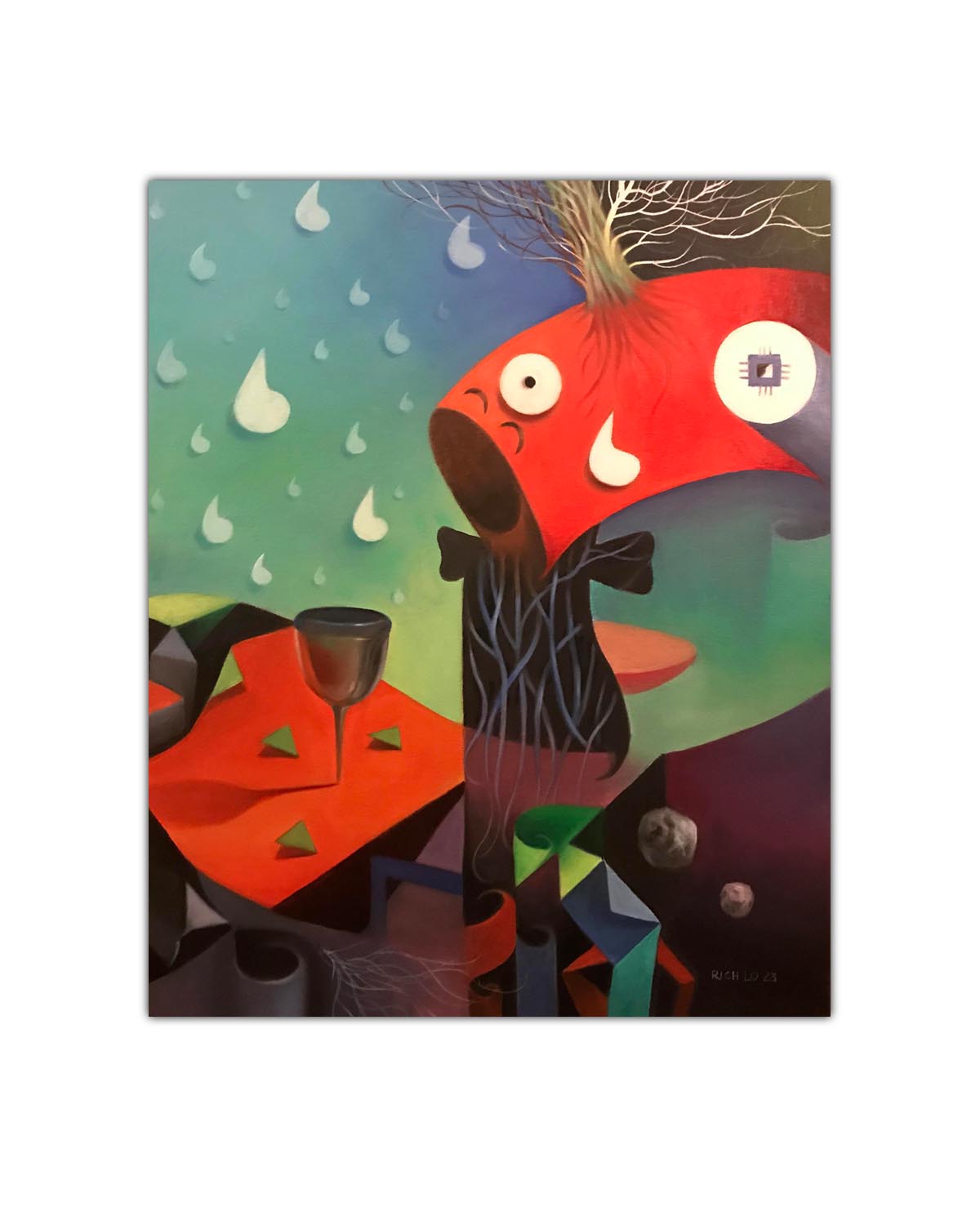 This whimsical and surreal oil painting presents a fantastical dreamscape.